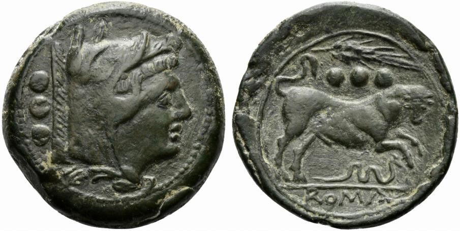 Anonymous, Quadrans, Sicily, ca. 214 BC; AE (g 14,03; mm 26; h 7); Head of Hercules r., wearing boar's skin; behind, °°°, Rv. Bull charging r.; above, °°° and corn ear; below, snake; in ex. ROMA. Crawford 42/2; Sydenham -.Dark green patina; extremely fine.
