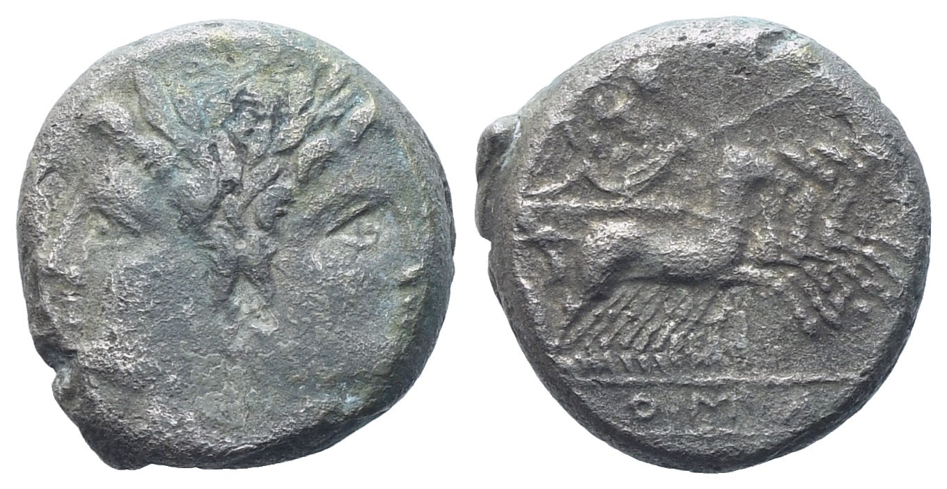 Laureate head of Janus; Rv. Jupiter, hurling thunderbolt and holding sceptre, in galloping quadriga right driven by Victory; ROMA in relief within linear frame. Debernardi A7. aVF
