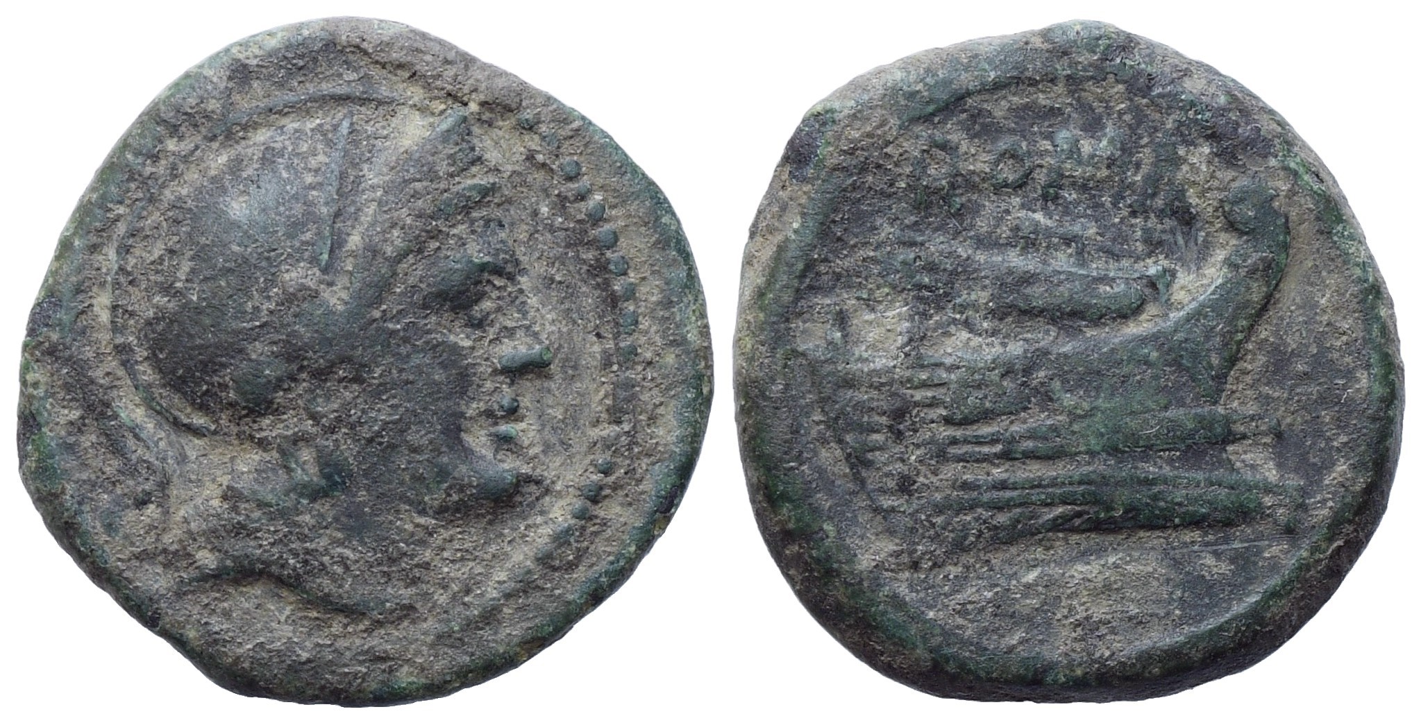Helmeted head of Roma r. Rev. ROMA Prow r. Sydenham 88. RBW 103. Crawford 38/8. Dark green-blue patina. VF