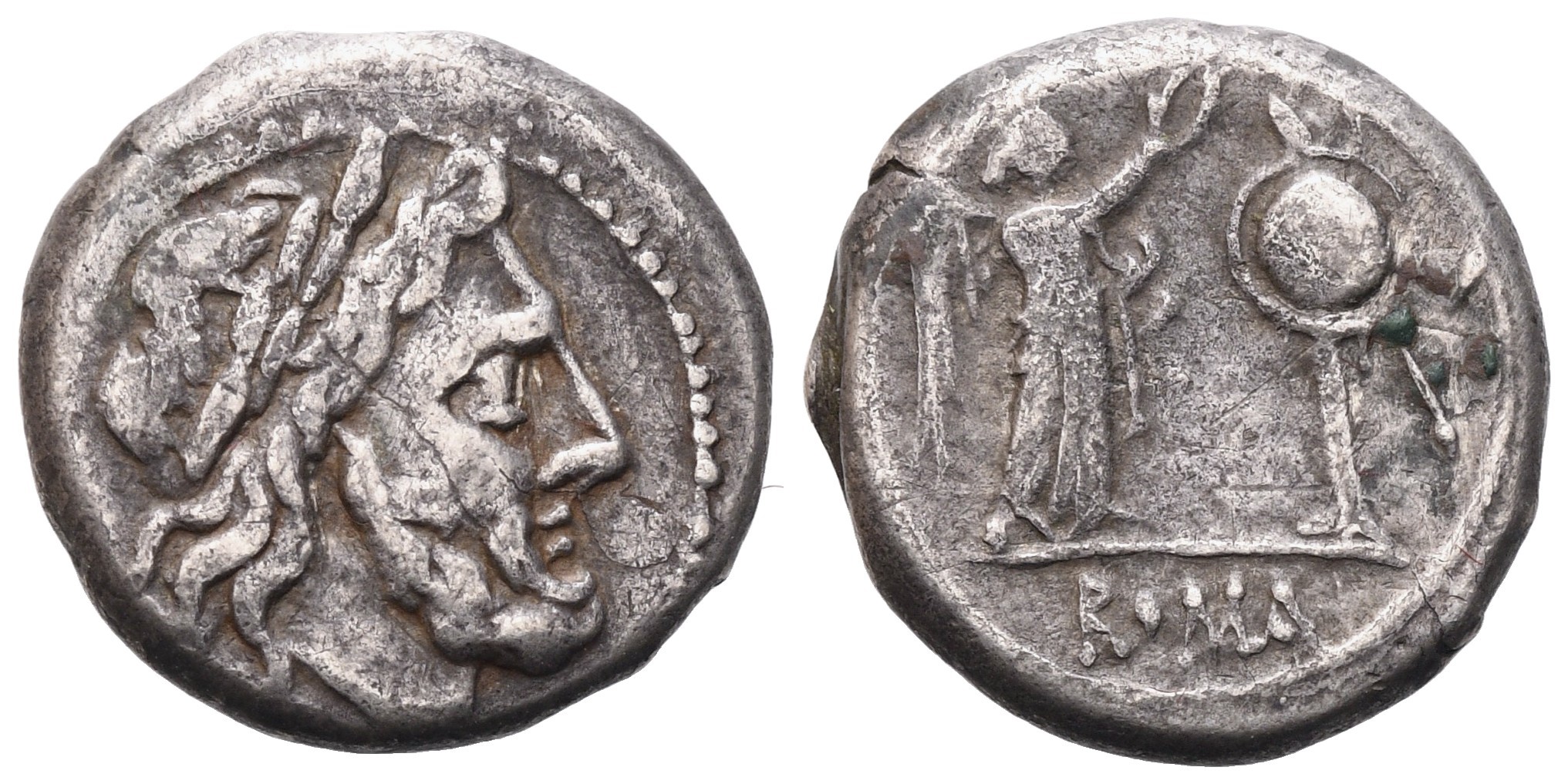 Laureate head of Jupiter right. Rev. Victory standing right, crowning trophy; in exergue, ROMA. Crawford 53/1. Sydenham 83. Near VF.