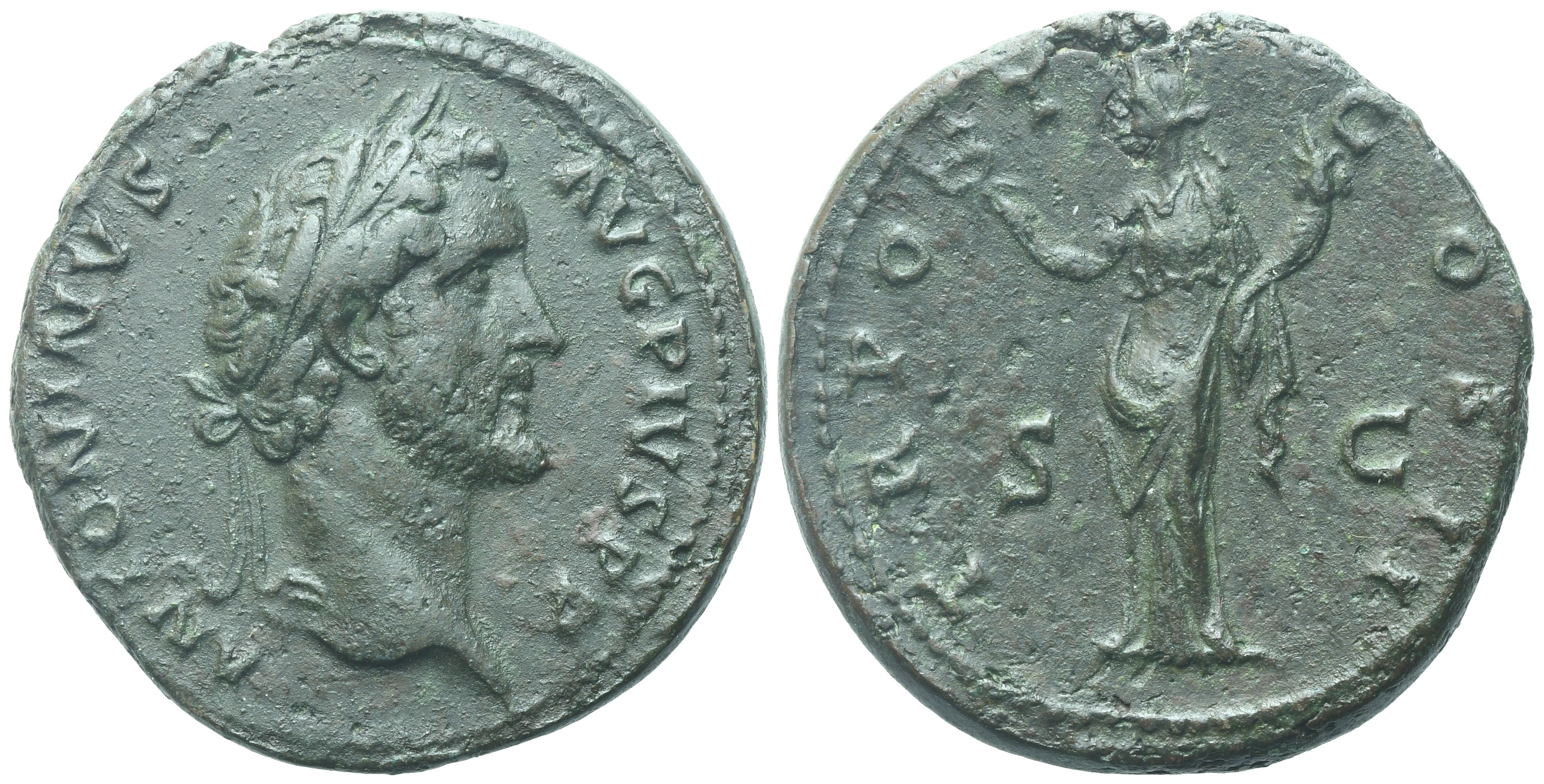 ANTONINVS AVG PIVS PP Laureate head r.; Rv. TR POT COS II - SC Felicitas standing l. with caduceus and cornucopia. RIC 565a, Cohen 854. Appealing green patina. Good very fine.