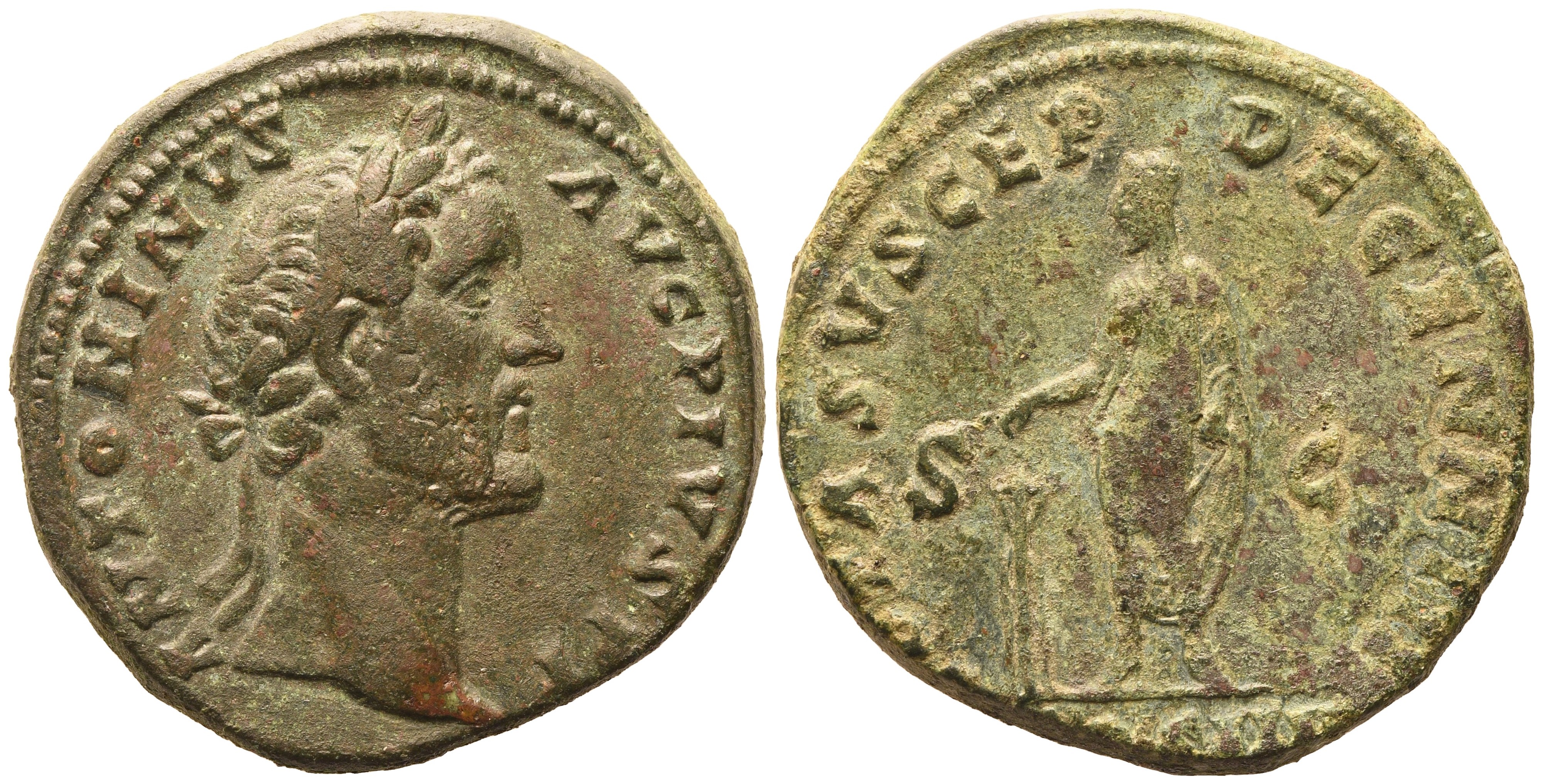 ANTONINVS AVG PIVS P P Laureate head r.; Rv.VOTA SVSCEP DECENN III Togate emperor standing facing, head to l., sacrificing from patera over tripod altar to l.; S-C across fields, COS IIII in exergue. RIC 794. Green patina with red hues. Good very fine.