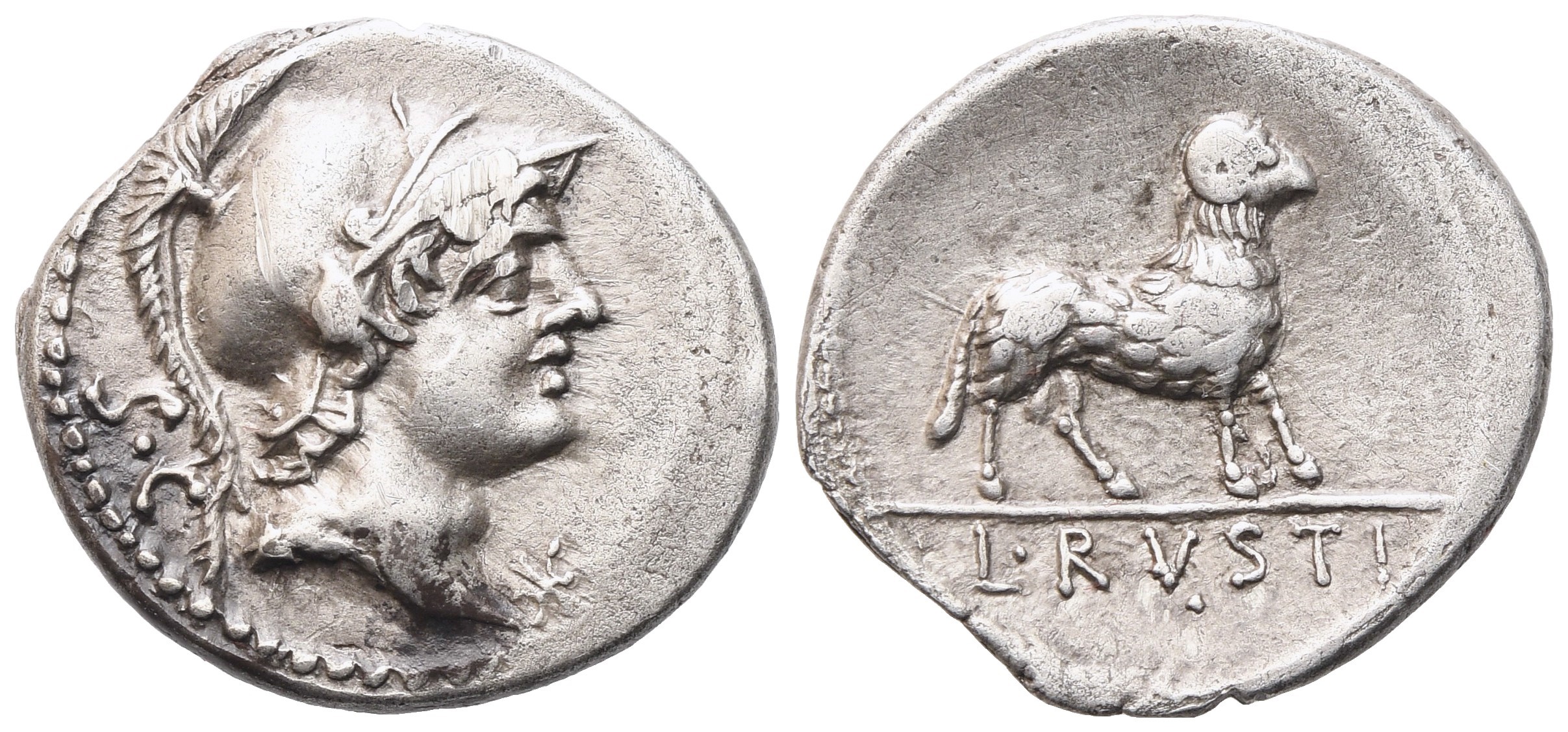 Helmeted head of Mars r.; S•C behind, * (XVI monogram) below chin; Rv. Ram standing right; L•RVSTI below. Crawford 389/1; RSC Rustia 1. Good very fine.