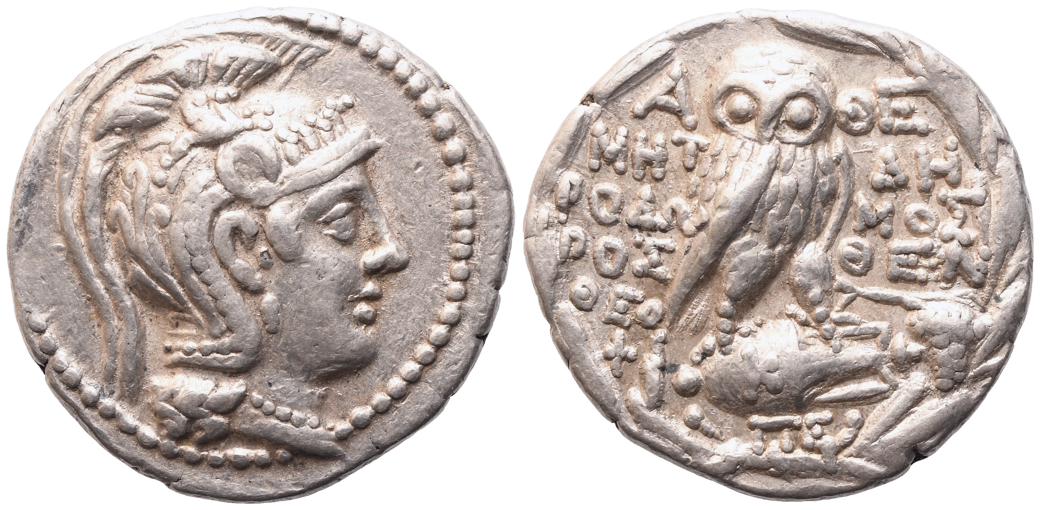 Metrodoros, Demosthenes, Theophi(...), magistrates. Helmeted head of Athena r., helmet decorated with Pegasos springing r.; A-ΘE Owl standing right, head facing, on overturned amphora; in fields, magistrates' names: MHT/POΔΩ/POΣ/ΘΕΟ/Φ - ΔH/MOΣ/ΘEN; in right field, bunch of grapes; K on amphora, `ΠΣ below; all within laurel wreath. Thompson 640f, HGC 4, 1602. About extremely fine.