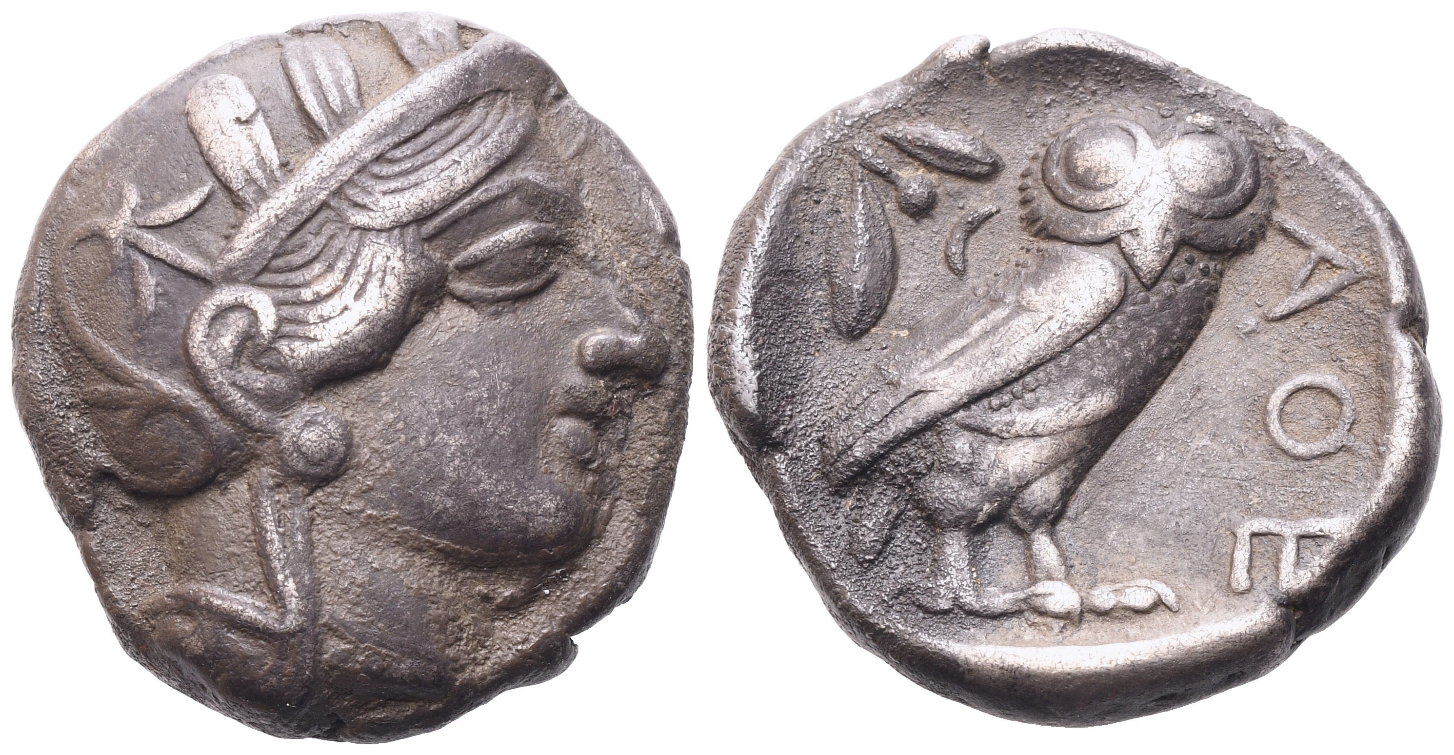 Head of Athena right, wearing earring, necklace, and crested Attic helmet ornamented with three laurel leaves and vine scroll; Rv. AΘE, owl standing right, head facing; olive sprig with two leaves and one berry, and crescent moon behind, all within incuse square. Kroll 8. SNG Copenhagen 31-40. HGC 4, 1597. gVF