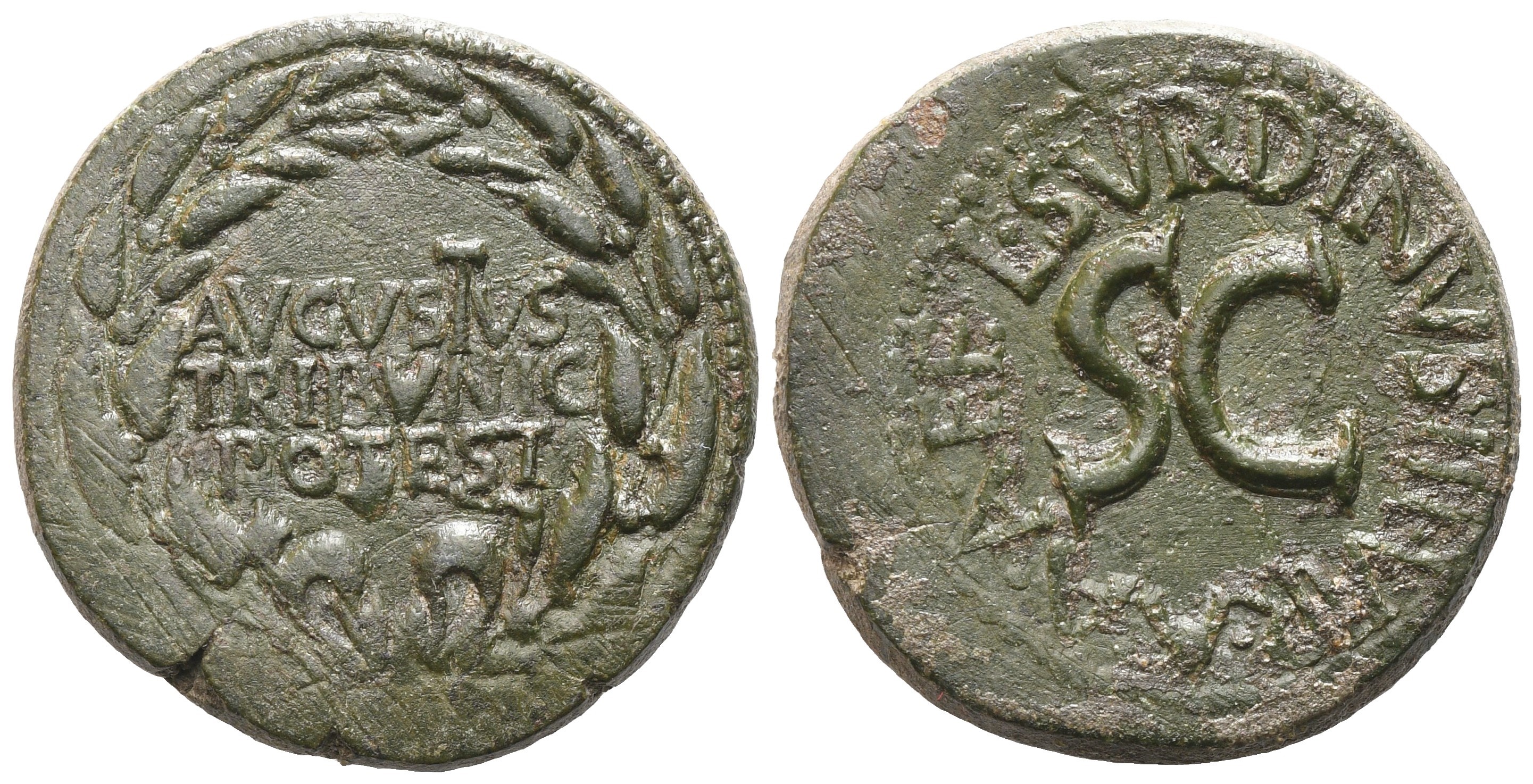 L. Naevius Surdinus, moneyer. AVGVSTVS / TRIBVNIC / POTEST in three lines in oak-wreath; Rv. L SVRDINVS III VIR A A A F F around large S•C. RIC I 384(R), Cohen 472 var. (2). Dark olive green patina. Very fine.