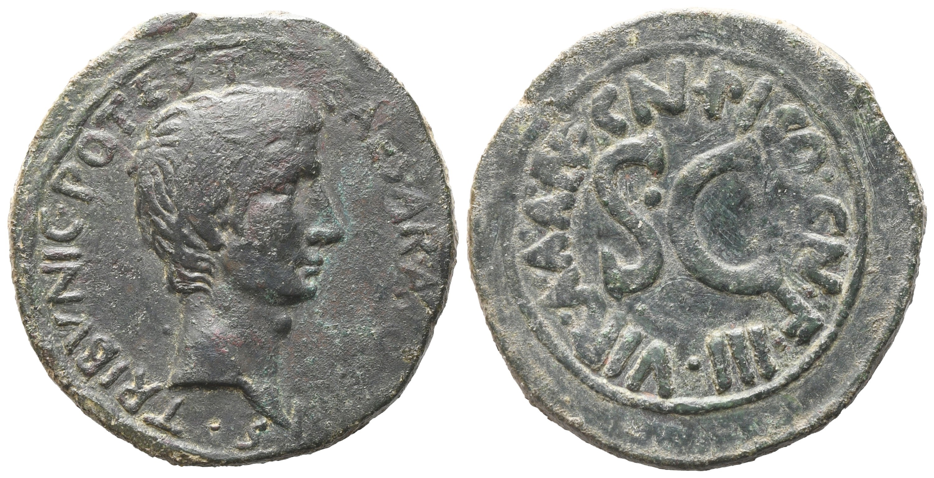 CAESAR A[VGVSTV]S TRIBVNIC POTEST Around bare head of Augustus to r.; Rv. CN PISO CN F III VIR A A A F F around large SC. S.1681, RIC 382, CBN 450. Grey-green patina. Good very fine.