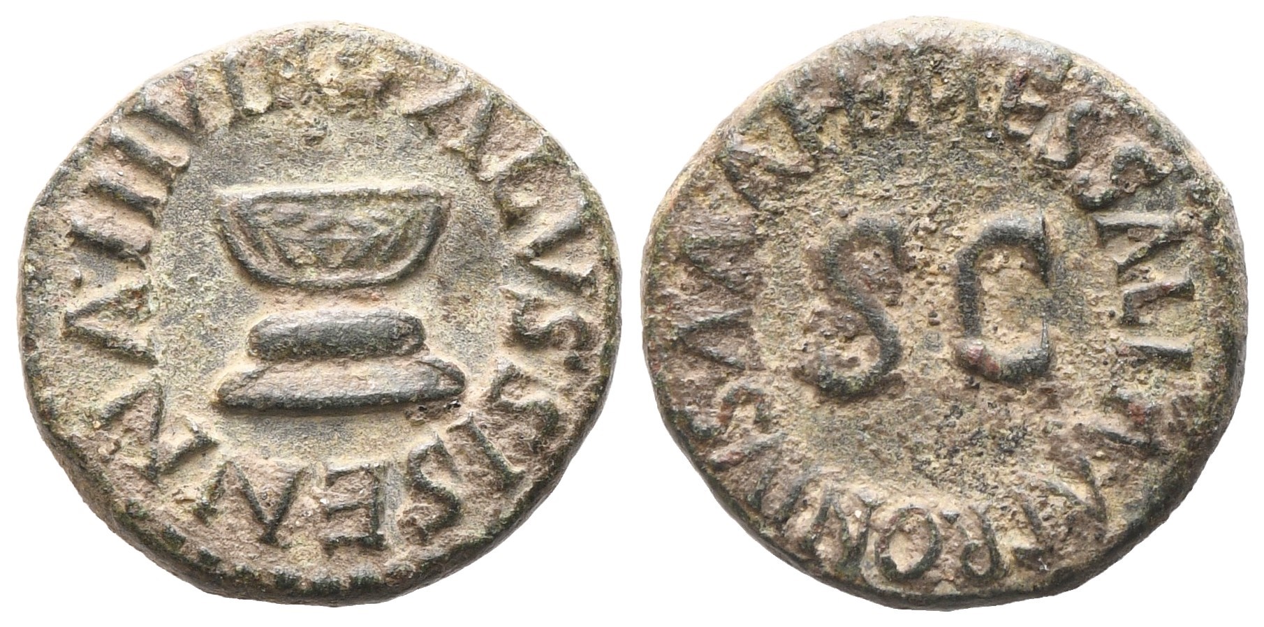 GALVS SISENNA III VIR around garlanded altar; Rv. MESSALLA APRONIVS A A A F F around large S C. RIC 462; Cohen 425; CBN 839; BMC 262. Sandy, light brown patina. Good very fine.