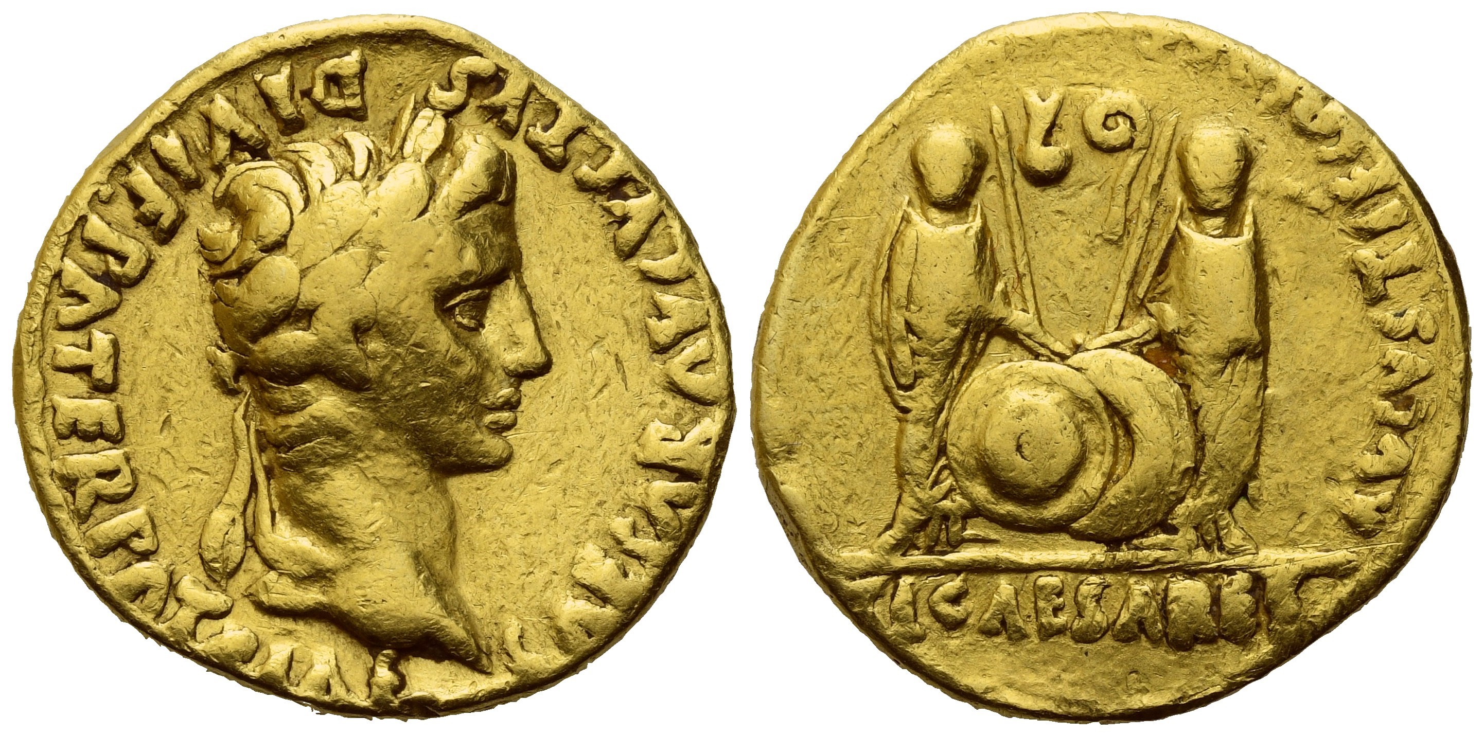 CAESAR AVGVSTVS-DIVI F PATER PATRIAE Laureate head of Augustus r.; Rv. AVGVSTI F COS DESIG PRINC IVVENT Gaius and Lucius Caesars, both togate, standing facing, each resting inner hand on grounded shield with spear behind; simpulum (on left) and lituus (on right) turned inwards in upper field; C L CAESARES in exergue. Calicó 176a. RIC I 206. Almost gVF