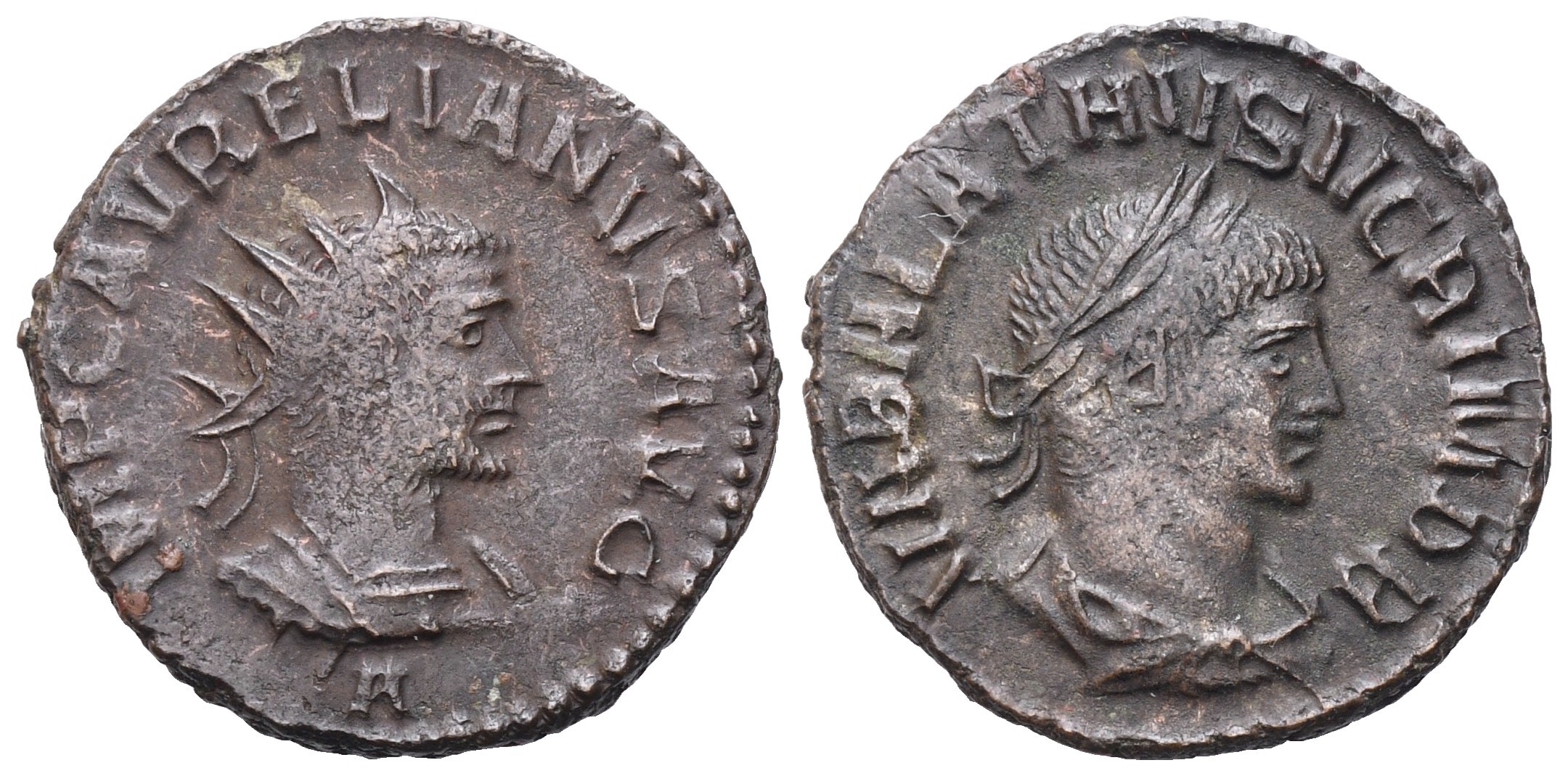 IMP C AVRELIANVS AVG Radiate and cuirassed bust of Aurelian to r.; A below. Rev.: VABALATHVS V C R IM D R, laureate, diademed, draped and cuirassed bust of Vabalathus to r. Ric V 1 381; MER/RIC 3106. Good very fine.
