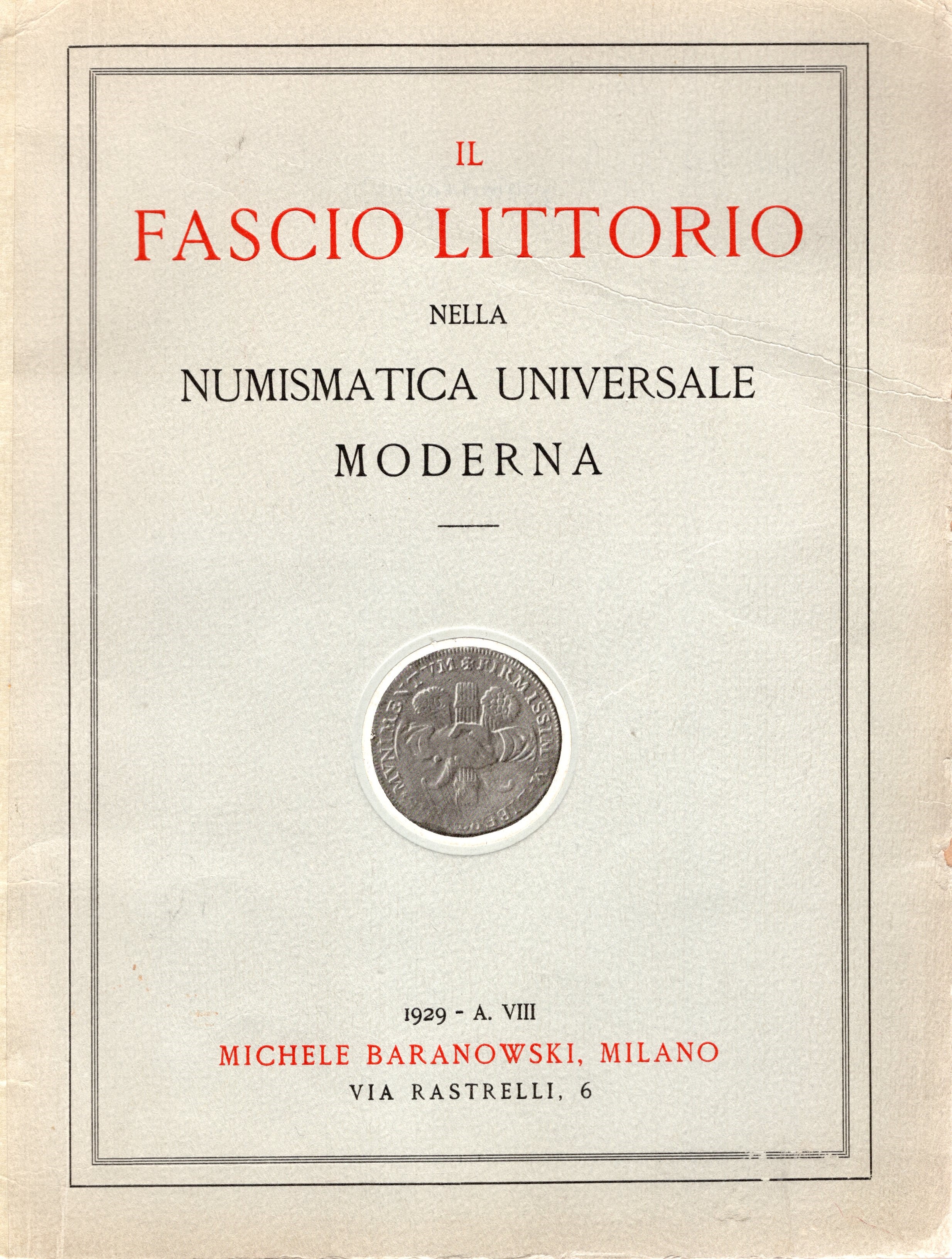 BARANOWSKY M. – Milano, 14 – Dicembre, 1929. Il Fascio Littorio nelle numismatica universale moderna. Pp. 23, nn. 323, tavv. 6. Brossura ed. sciupata, interno buono stato, raro e importante racco