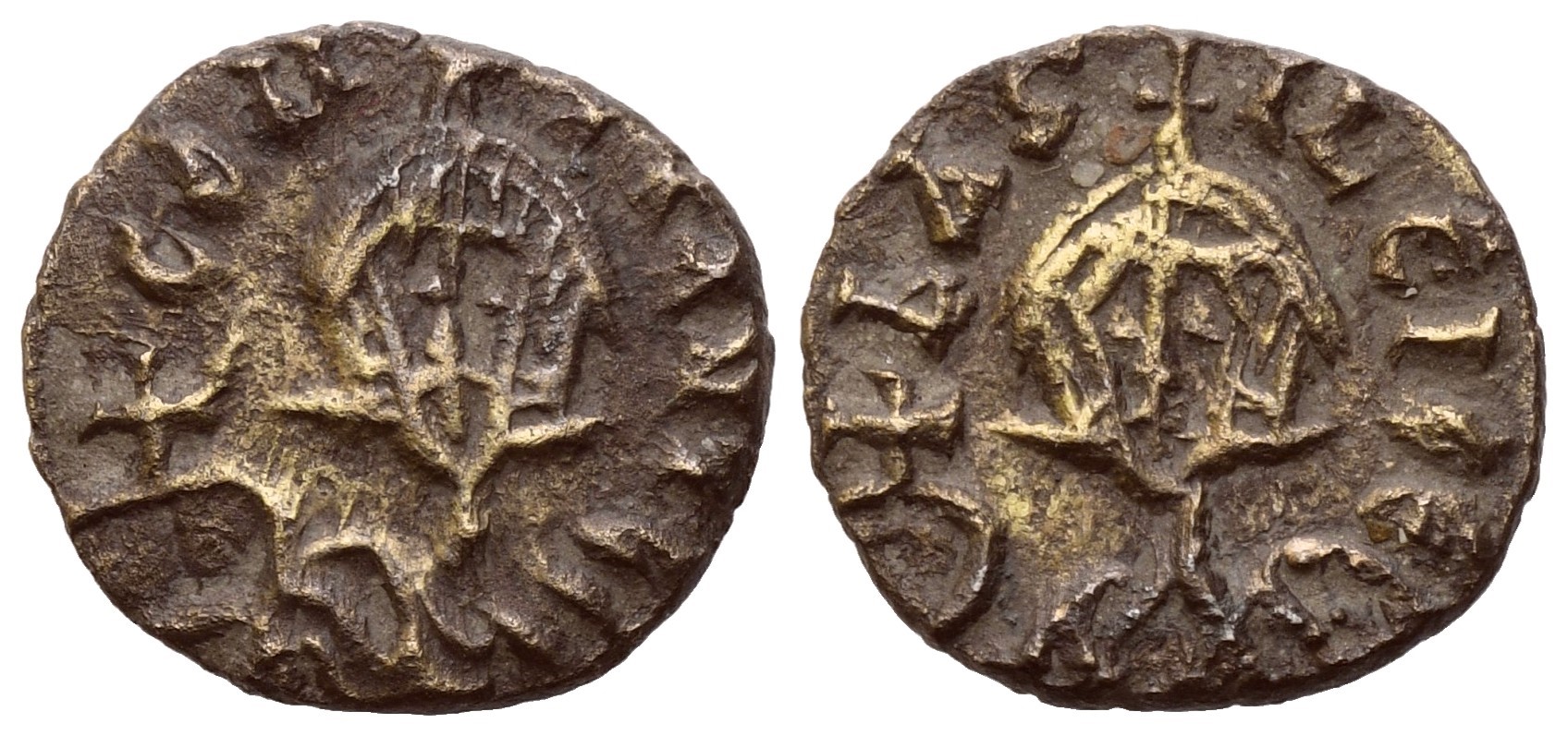 Crowned facing bust of Basil, wearing loros, holding globus cruciger; Rv./ Crowned facing bust of Constantine, wearing chlamys, holding globus cruciger. DOC 15. Anastasi 585a. SB 1714. gVF.