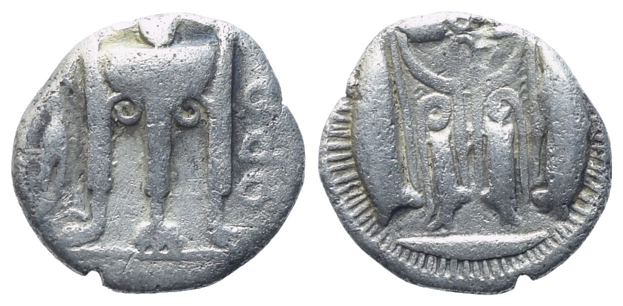 Tripod, legs terminating in lion's feet; QPO upwards to right; to l., crane standing to r.; Rv. Incuse tripod. SNG ANS 314; HN Italy 2105. VF
