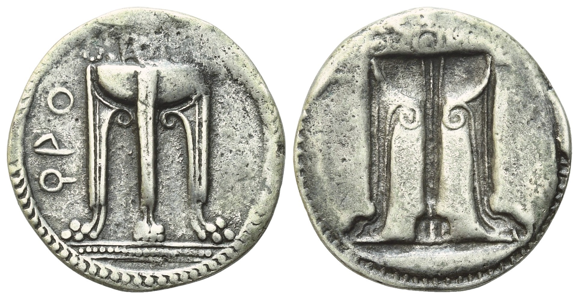 QΡΟ Tripod with legs ending in lion's feet, and with three handles and snakes rising from the bowl. Rev. Same type as the obverse, but incuse and without the legend. HN Italy 2075. SNG ANS 227-234. Good very fine.