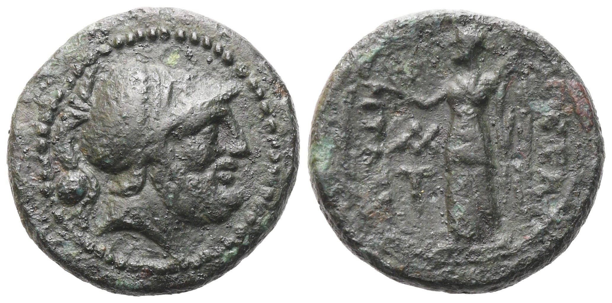 Head of Ares r., wearing Corinthian helmet; behind, globe; Rv. PETH-LINWN Nike standing front, head l., holding wreath in r. hand; in fields, monograms. SNG ANS 619 (var.); SNG Cop. 1921(var.). Dark grey-green patina. VF