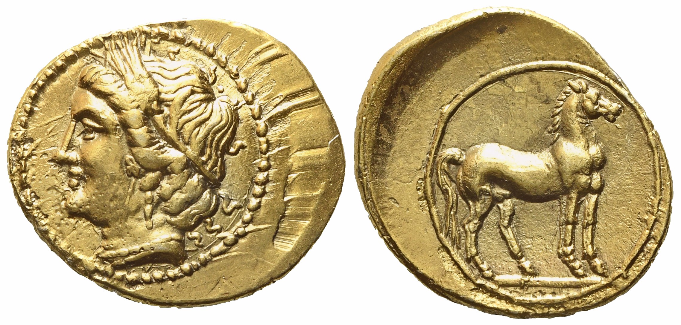 Wreathed head of Tanit left; Rv. Horse standing r. Jenkins-Lewis, pl. 28, 2; Robinson, 3; SNG Cop. 369; coll. Dewing 994-995. 1,58g. Rare. Extremely fine.
