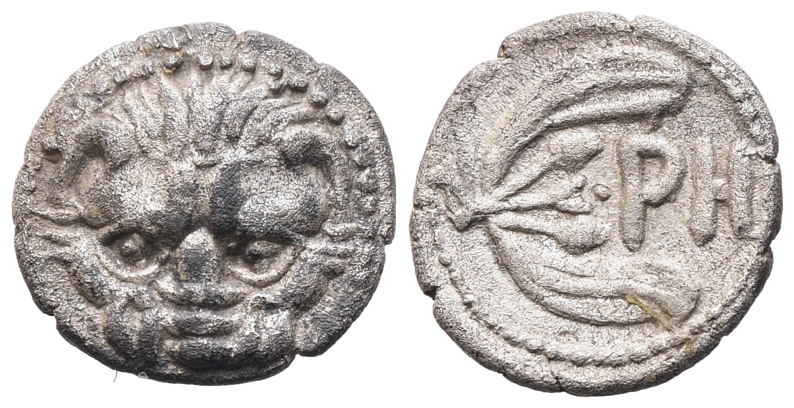 Lion's mask; Rv. RH Olive twig with two berries and two leaves. SNG ANS 670. Extremely fine.