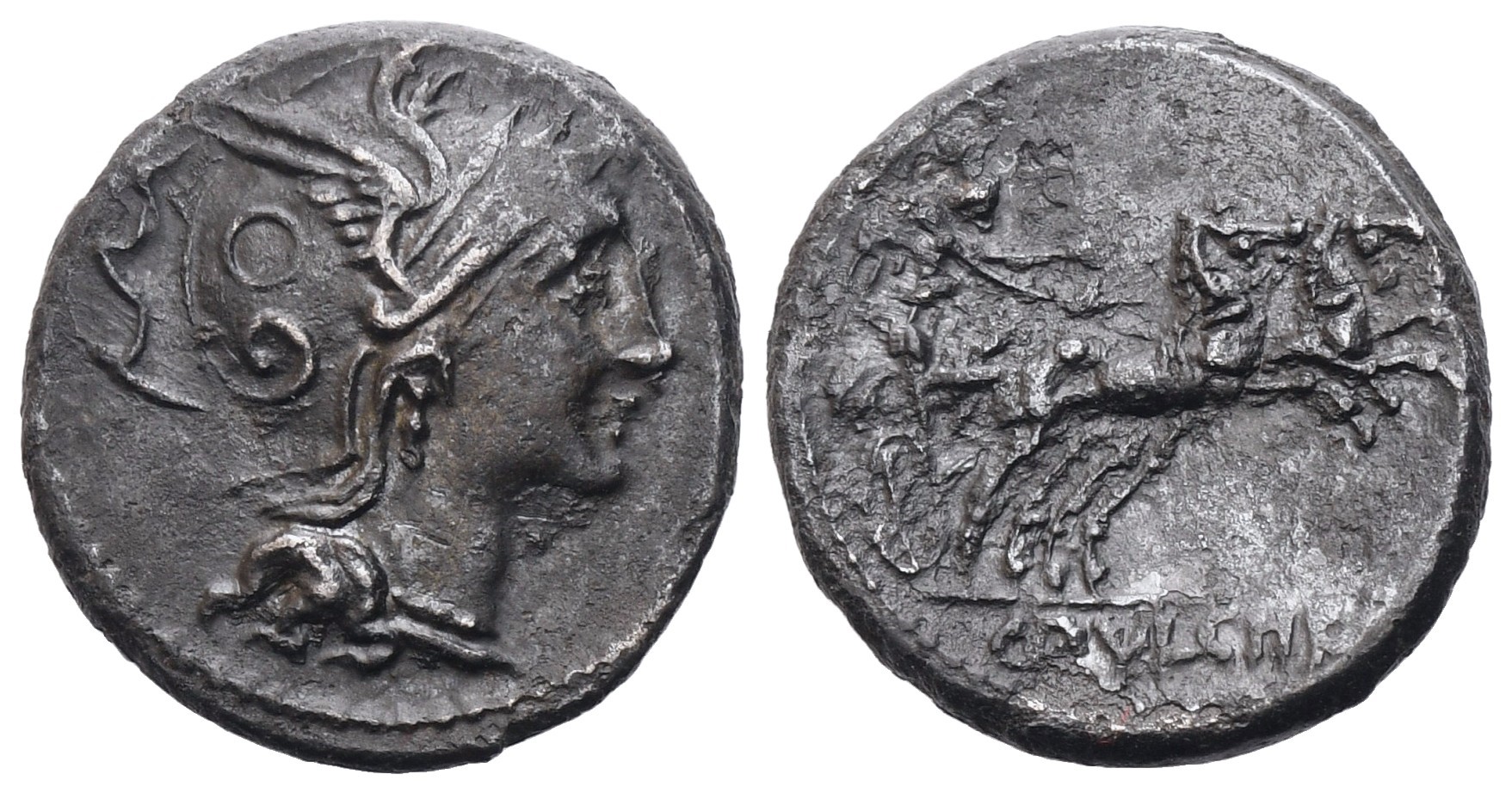 Helmeted head of Roma r. (helmet decorated with circular device); Rv. Victory in biga r., holding reins in both hands; in exergue, C·PVLCHE[R]. Crawford 300/1; Babelon (Claudia) 1; Sydenham 569. VF