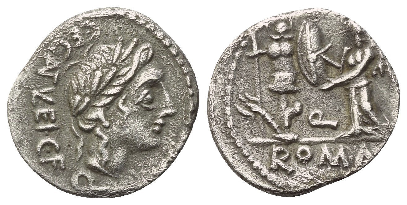 Laureate head of Apollo r.; behind, partially ligate, C·EGNATVLEI·C·F Q; Rv. Victory standing l., inscribing shield attached to trophy; in field, Q; in exergue, ROMA. Crawford 333/1; Babelon (Egnatuleia) 1; Sydenham 588.