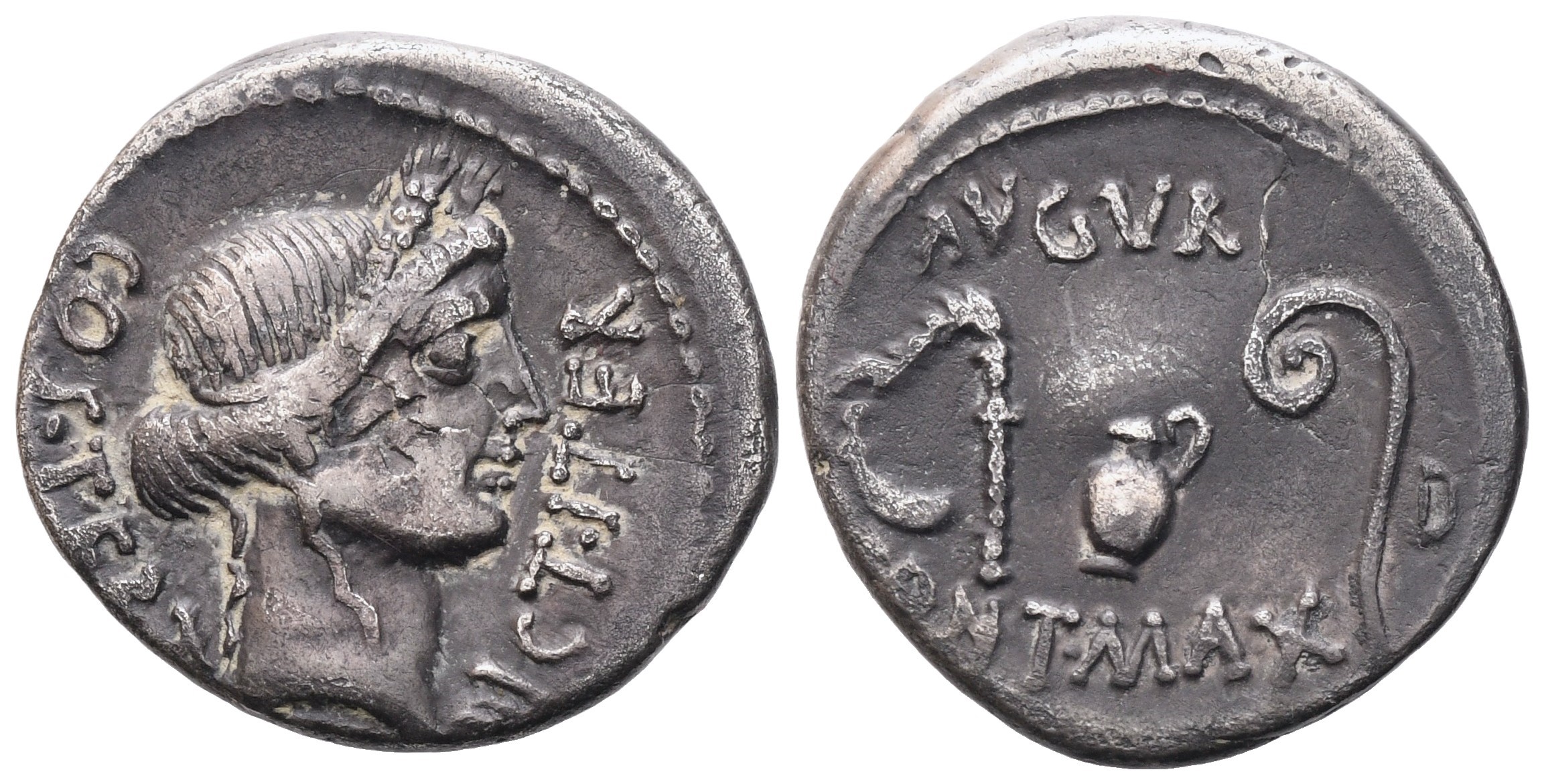 Uncertain mint (Utica?). COS·TERT – DICT·ITER Head of Ceres r., wearing wreath of barley; Rv. AVGVR Culullus, aspergillum, jug and lituus. In outer r. field, D and below, PONT·MAX. Crawford 467/1a; Babelon (Julia) 16; Sydenham 1023. VF