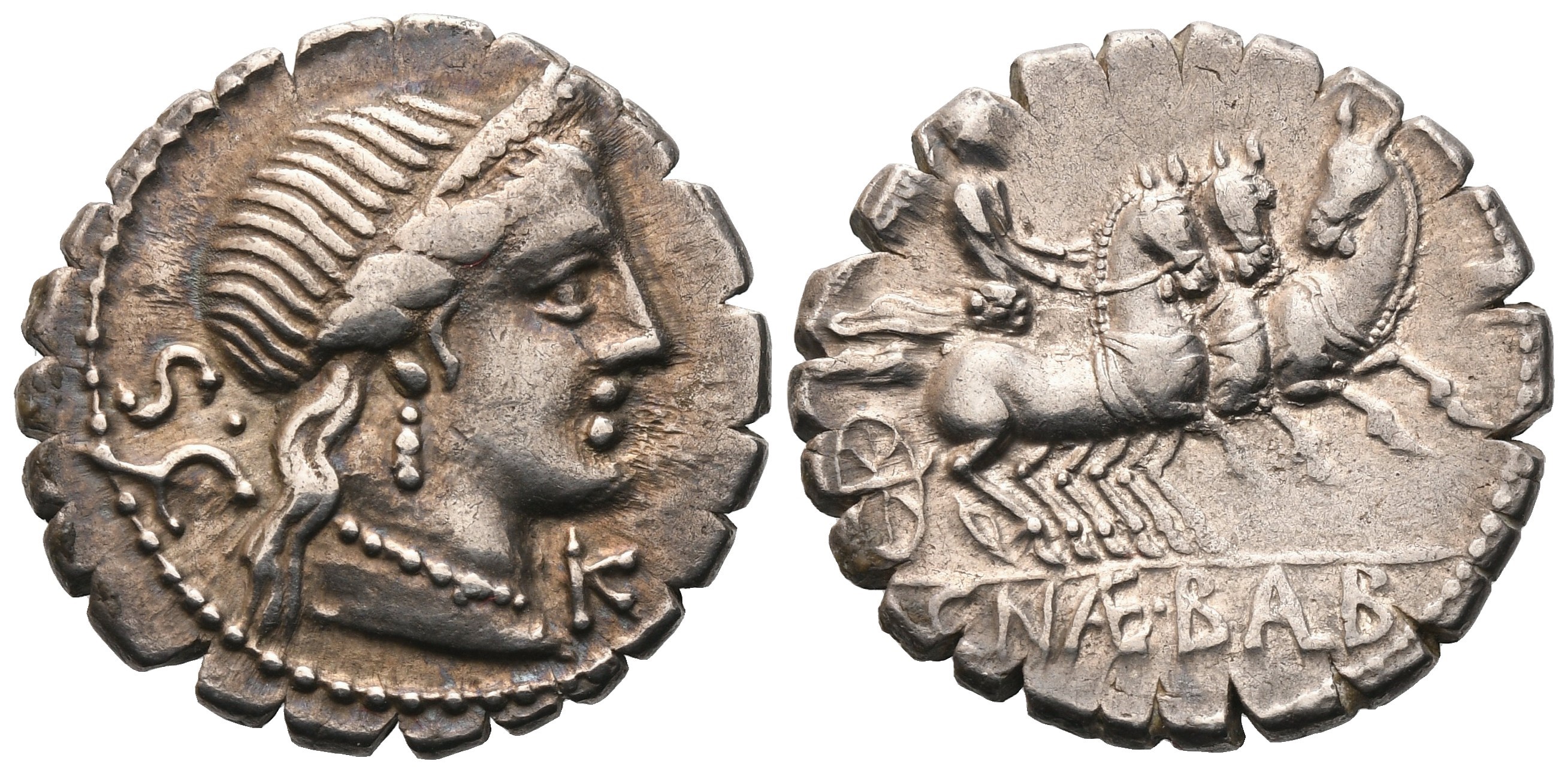Head of Venus r., wearing diadem; behind, S·C downwards; before, K (control letter); Rv. Victory in triga r., holding reins in both hands; in exergue, partially ligate, C·NAE·BALB. Crawford 382/1a; Babelon (Naevia) 6; Sydenham 769. Near extremely fine.