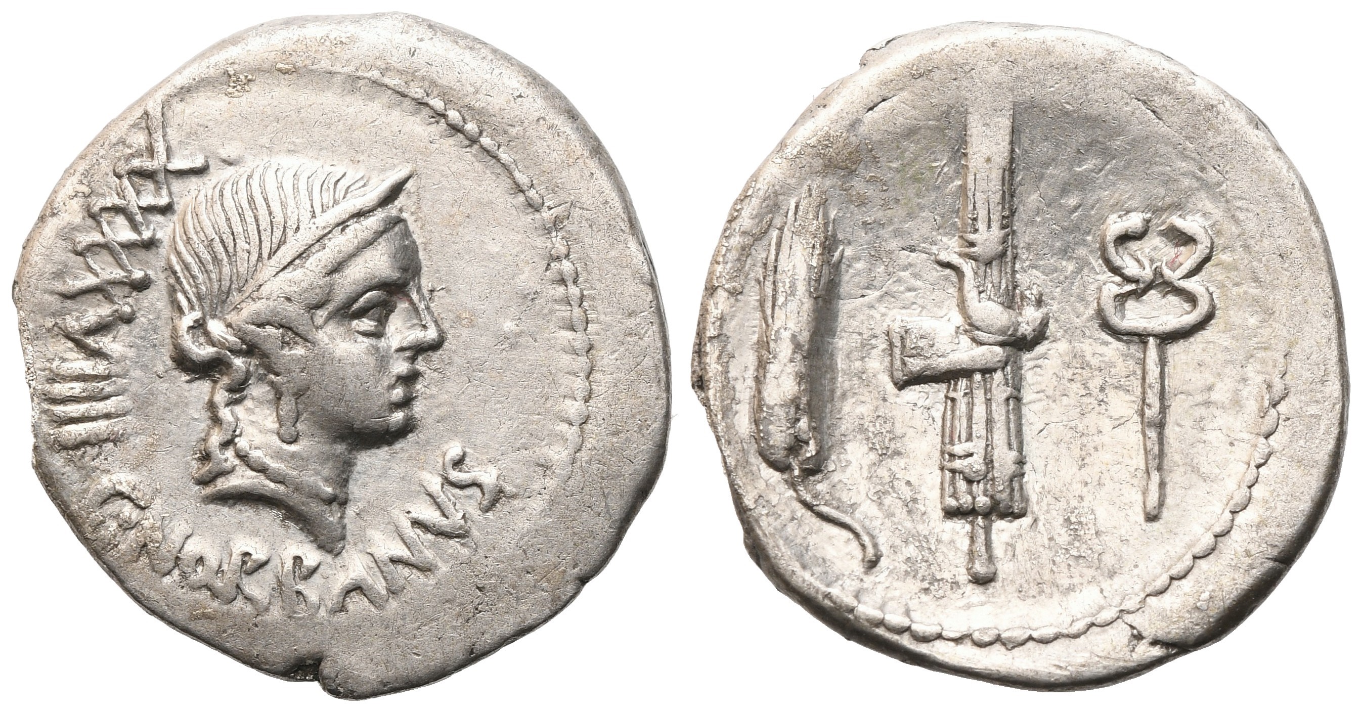 Diademed head of Venus r.; behind, XXXXVIIII (control mark); below, C·NORBANVS; Rv. Corn-ear, fasces with axe and caduceus. Crawford 357/1b; Babelon (Norbana) 2; Sydenham 739. Very fine.