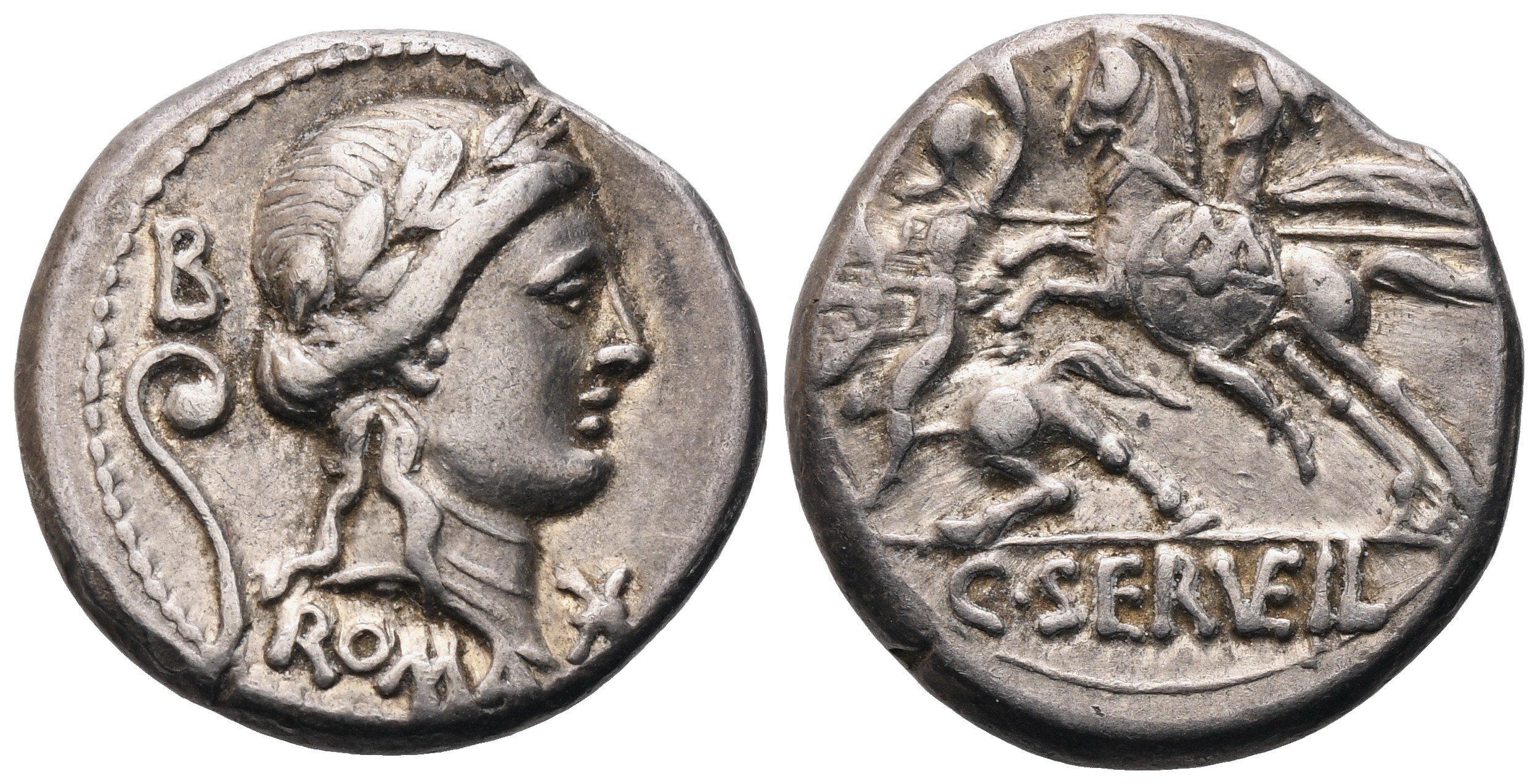 Laureate head of Apollo r.; behind, B over lituus; before, * (mark of value); below, ROMA; Rv. Battle on horseback between man armed with sword and man armed with spear; latter's shield inscribed M; in exergue, C·SERVEIL. Crawford 370/1b; Babelon (Servilia) 7; Sydenham 720. Good very fine.