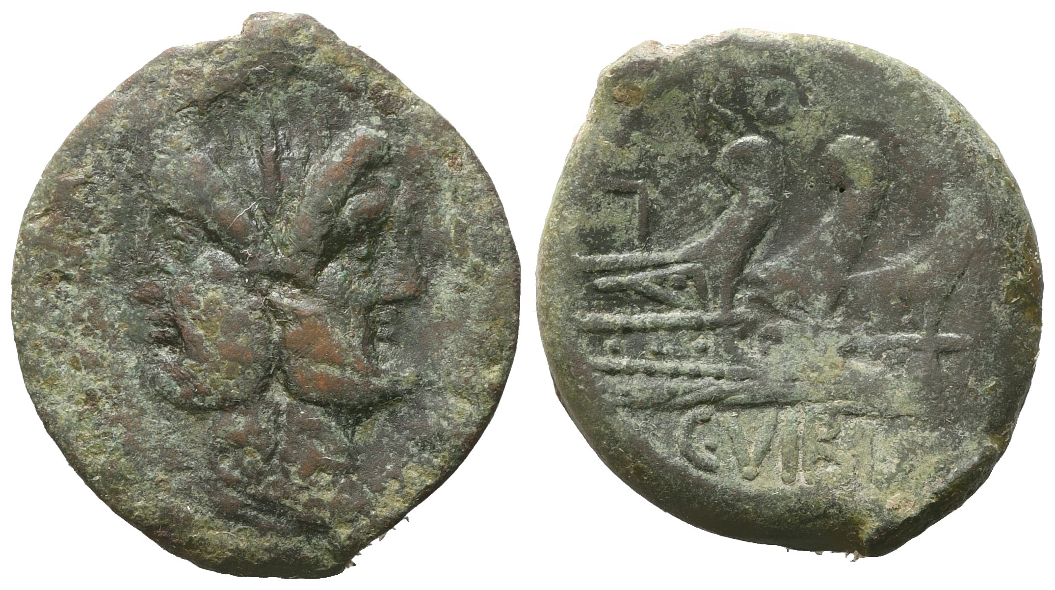 Mint: Rome. Laureate head of bearded Janus; I (mark of value) above; Rv. Three prows to r.; RO[MA] above, I (mark of value) to r., C·VIBI[·ANS] (partially ligate) in exergue. Crawford 342/7e; RBW 1292. Pleasing green patina. Good very fine.