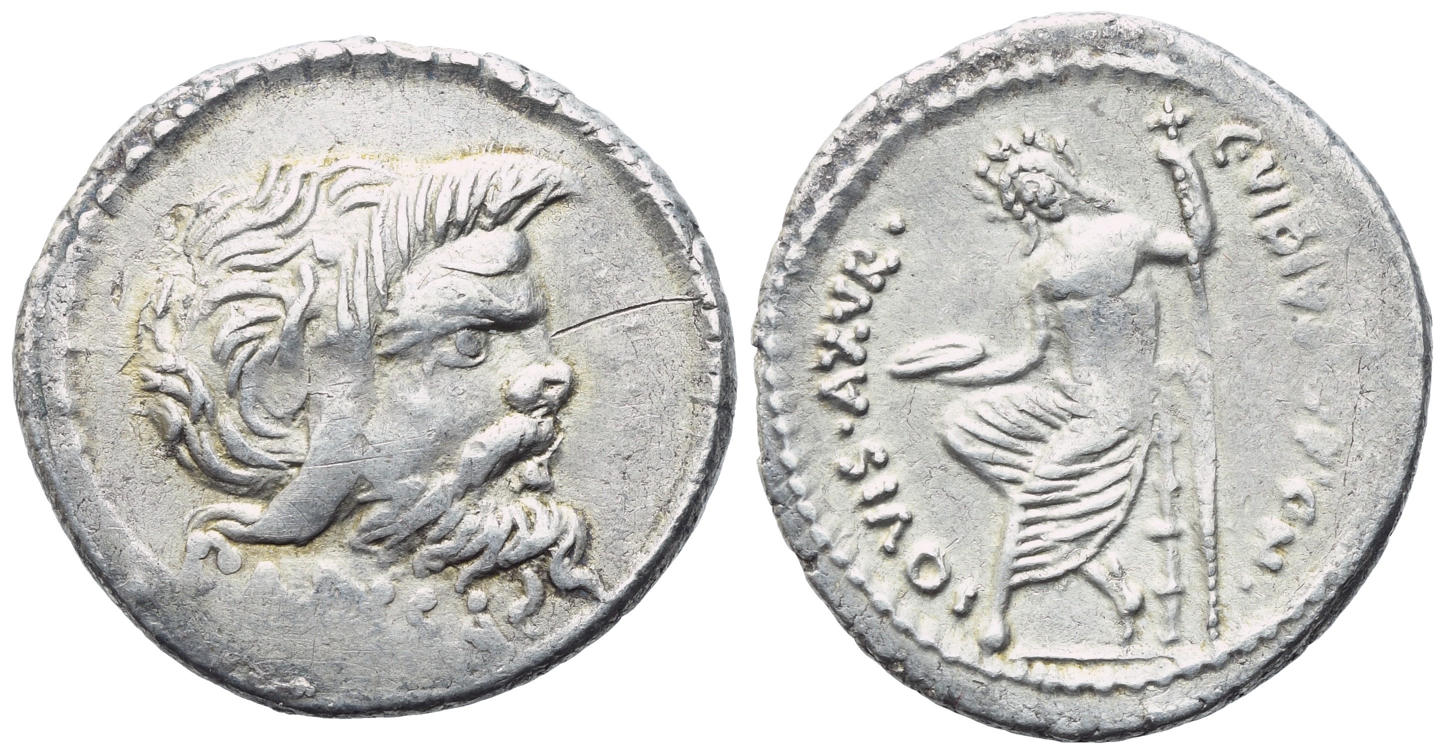 Mask of Pan r.; Rv. C VIBIVS C F C N IOVIS AXVR Jupiter Axurus seated l., holding patera and sceptre. Crawford 449/1a; CRI 20; Sydenham 947; Vibia 18. gVF