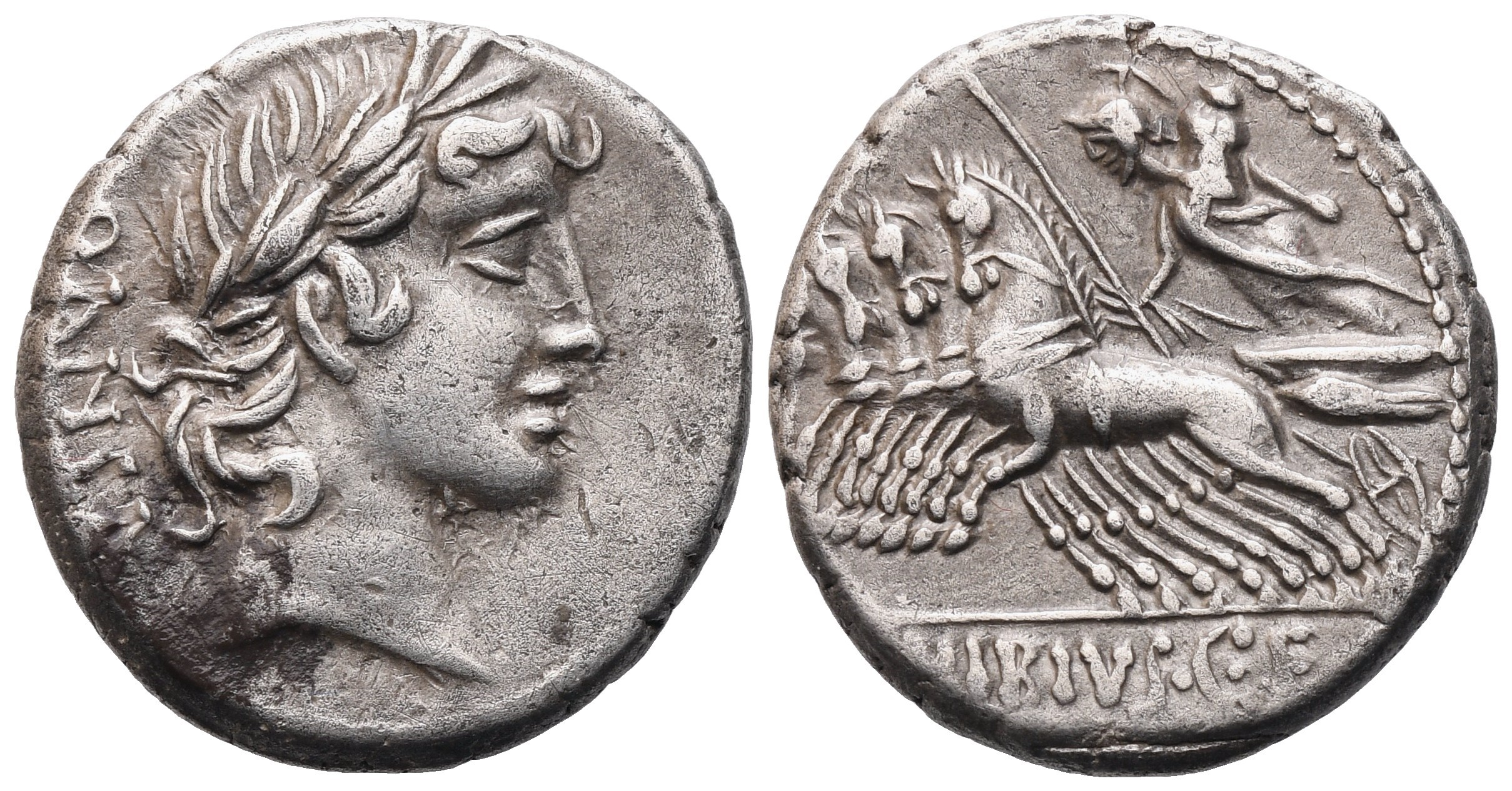 Laureate head of Apollo right; PANSA to l., [star below chin]; Rv.Minerva, holding trophy in right hand and spear and reins in left, driving galloping quadriga l.; C ·VIBIVS·C ·F below. Crawford 342/4b; Babelon (Vibia) 3; Sydenham 685. Good very fine / about extremely fine.