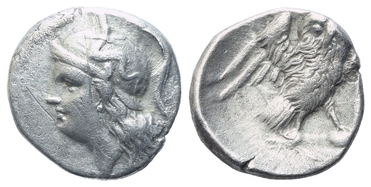 Helmeted head of Athena l.; Rv. [TAPANTINΩN] Owl standing right on thunderbolt, head facing. Vlasto 1077. HN Italy 1018. VF