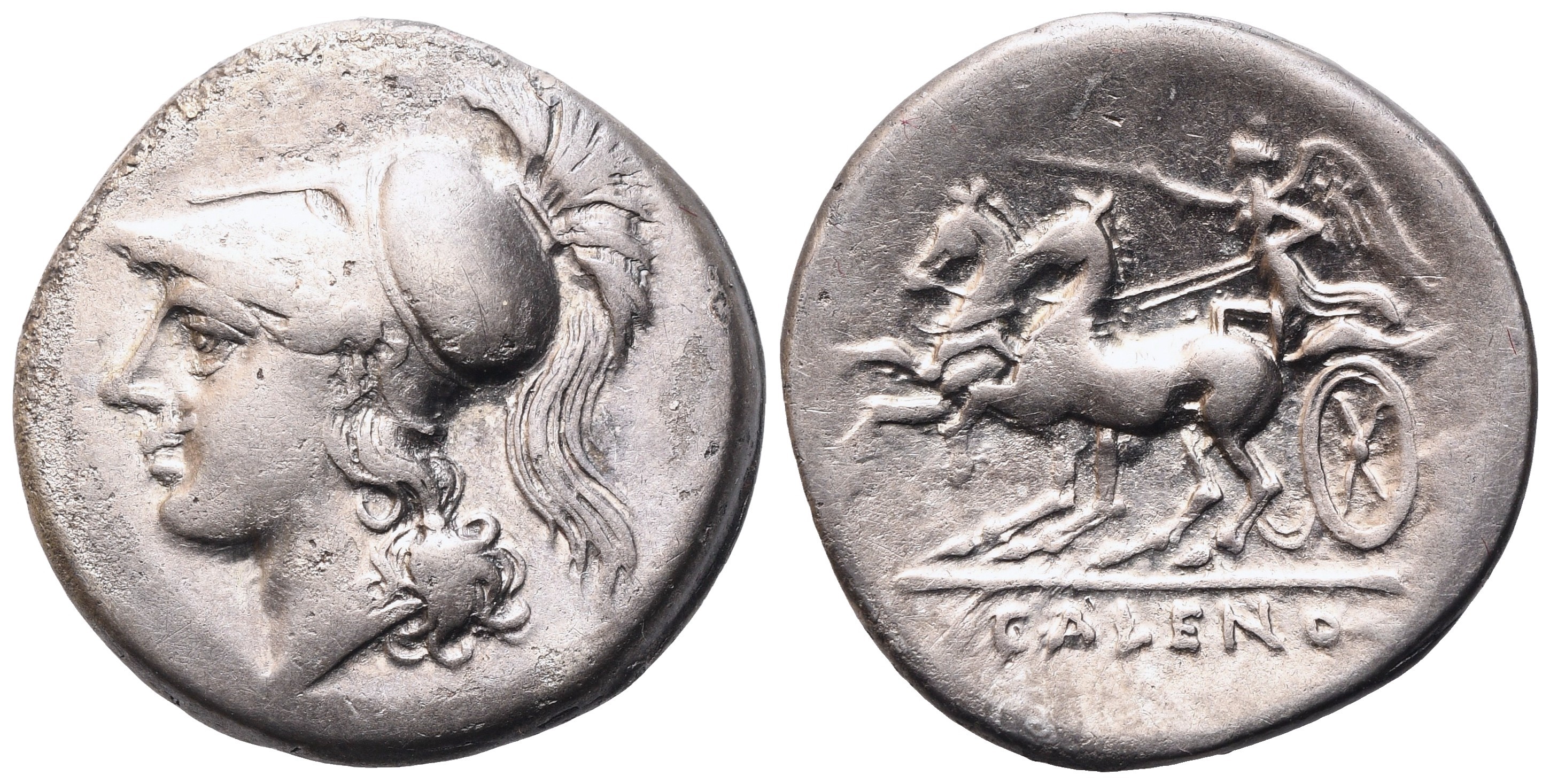 Head of Athena l., wearing crested Corinthian helmet decorated with a griffin; star behind, B below; Rv. Nike in biga galloping to l., holding reins in both hands, CALENO below. Sambon 887; SNG ANS 170 var. (obv. symbol); HN Italy 434 var. (same). Very fine.