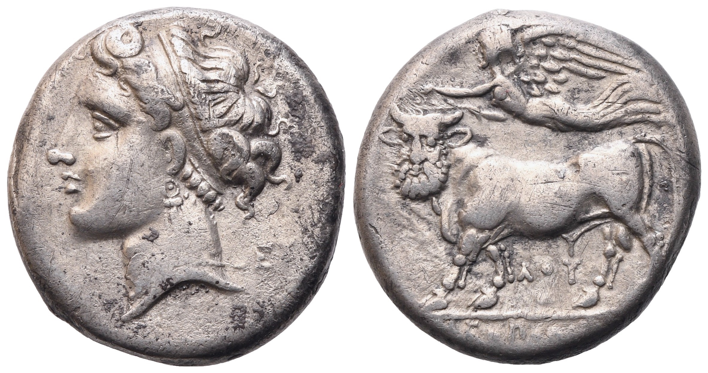Head of nymph l.; Rv. Man-headed bull standing λ., crowned by Nike. SNG ANS 381. gVF