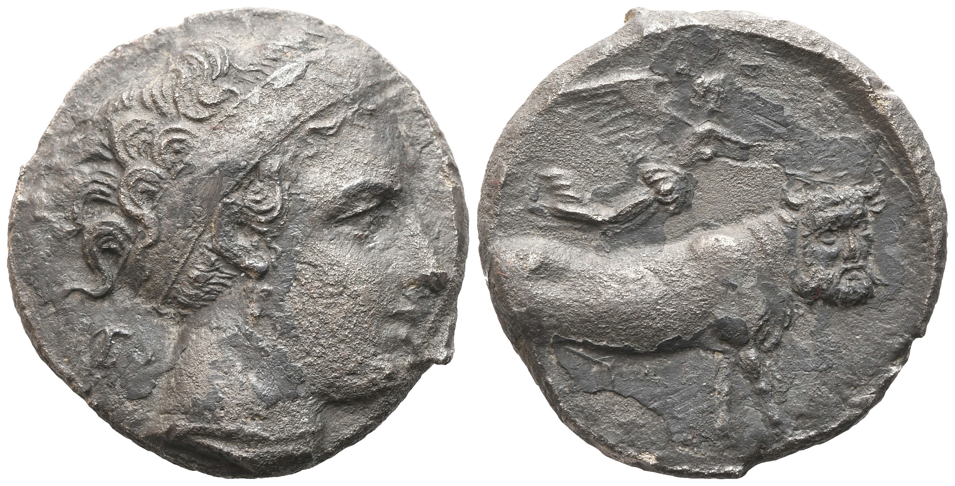 Head of nymph Parthenope r., wearing meander pattern diadem, earring and necklace; Rv. Man-headed bull advancing r., crowned by Nike flying r.; in exergue, [NE]OΠΟΛΙΤΗ[Σ]. Sambon 363 . SNG ANS 293 (these dies). Rutter 164. HN Italy 565. Corrosion spots, otherwise VF.