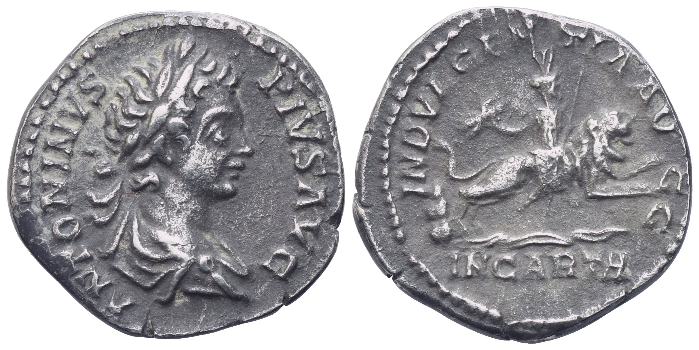 ANTONINVS PIVS AVG Laureate and draped bust r.; Rv. INDVLGENTIA AVGG / IN CARTH Dea Caelestis holding thunderbolt and sceptre, riding on lion running r. RIC 130. Good very fine.