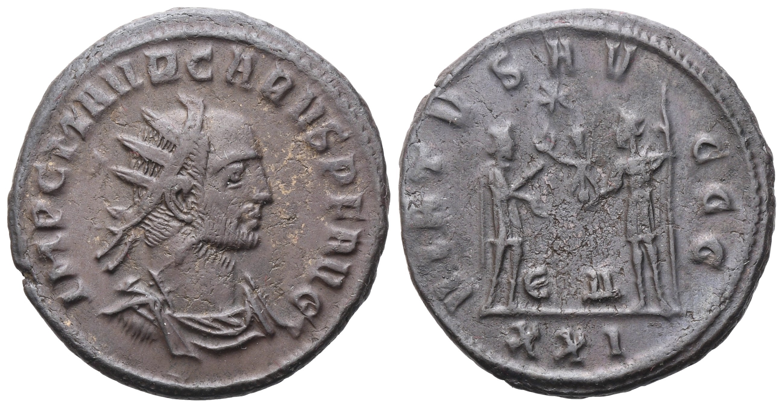 IMP C M AVR CARVS P F AVG Radiate, draped and cuirassed bust r.; Rv. VIRTVS AVGGG, Carus standing r., receiving Victoria on globe from Jupiter standing l. In, between Ε – Δ; XXI in exergue. RIC 125; Cohen 117. Good very fine.