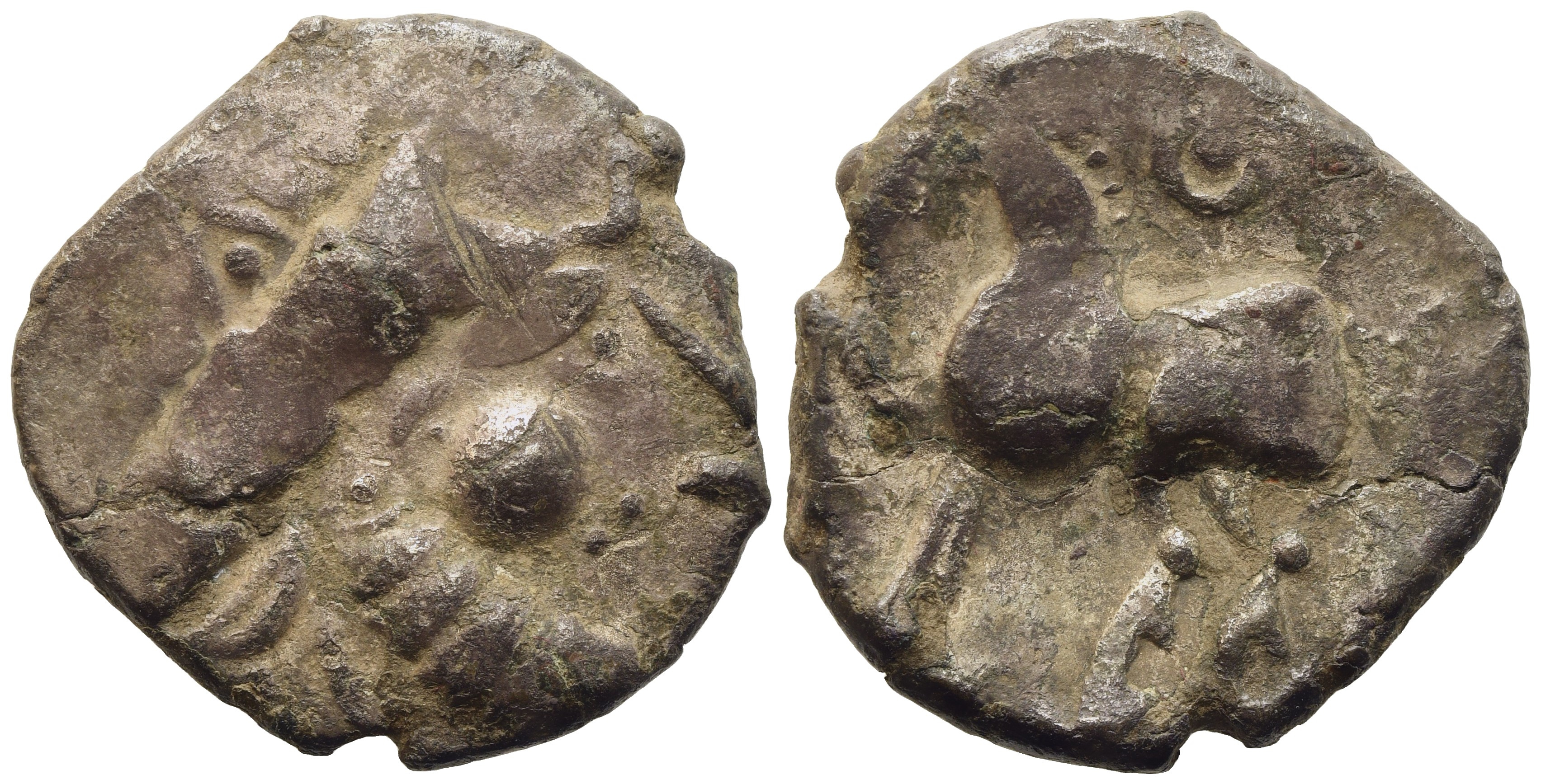 Laureate and bearded head to right; Rv. Horse prancing to left; pellet-in-annulet above. Cf. Göbl, OTA pl. 17, 193/14 var.; Lanz 480. Brown patina with some lighter hues. About very fine.