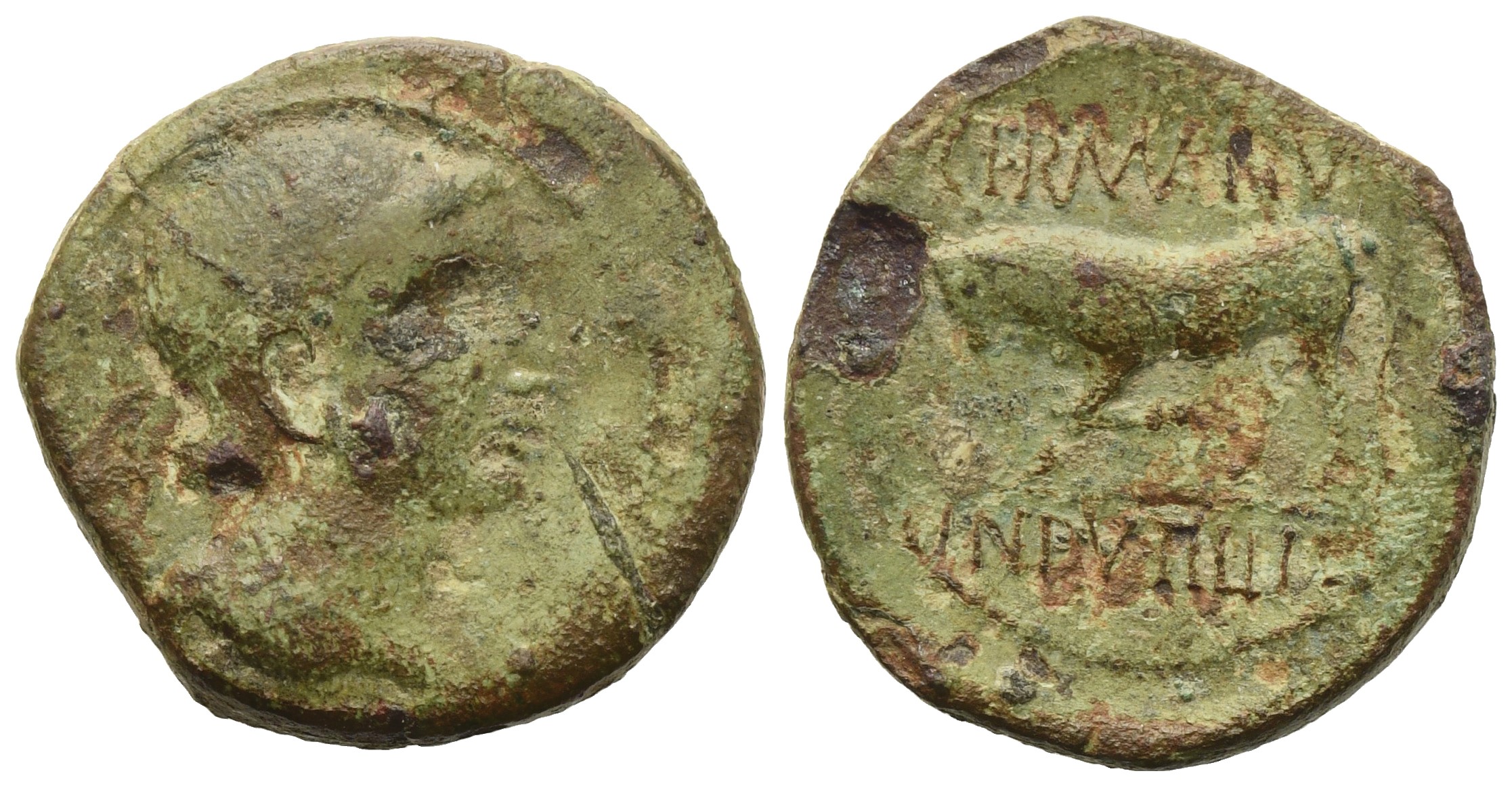 Diademed male head right; Rv. Bull left, GERMANVS above, INDVTILLI in exergue. LT 9248; BN.9245-9265; ABT 390; Sch/L 1181; Sch/SM 872. Green patina with brown and red spots. aVF