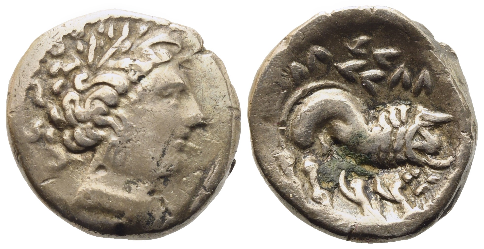 Imitating Massalia. Head of Artemis right; Rv. Lion standing right, MAΣΣA above. LT 2126; BM 3-6; Pautasso 391-410. Very fine.