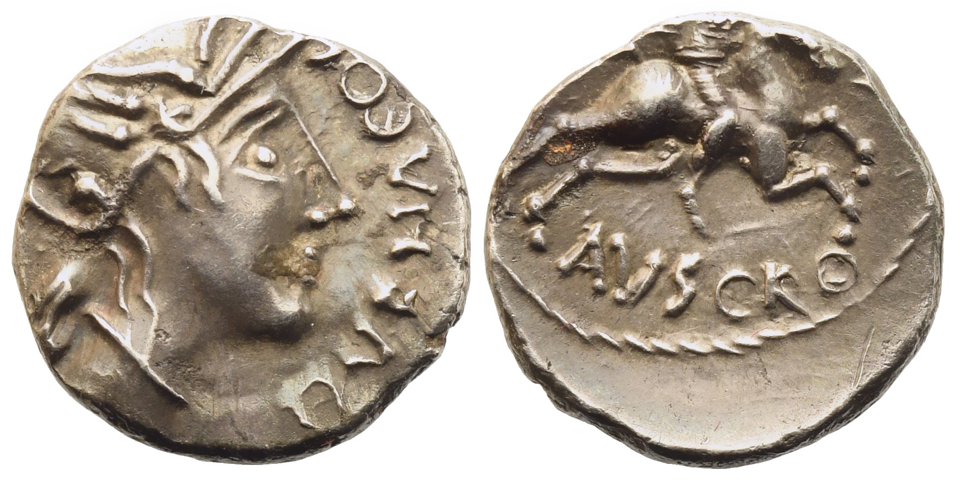 DVRNAEOS (sic!), helmeted head of Roma to right; Rv. AVSCRO, horseman galloping right, cloak floating over shoulder, holding spear in right hand. LT 5762; Sch/L 273; Sch/SM 88. Reverse slightly off centre, otherwise very fine.