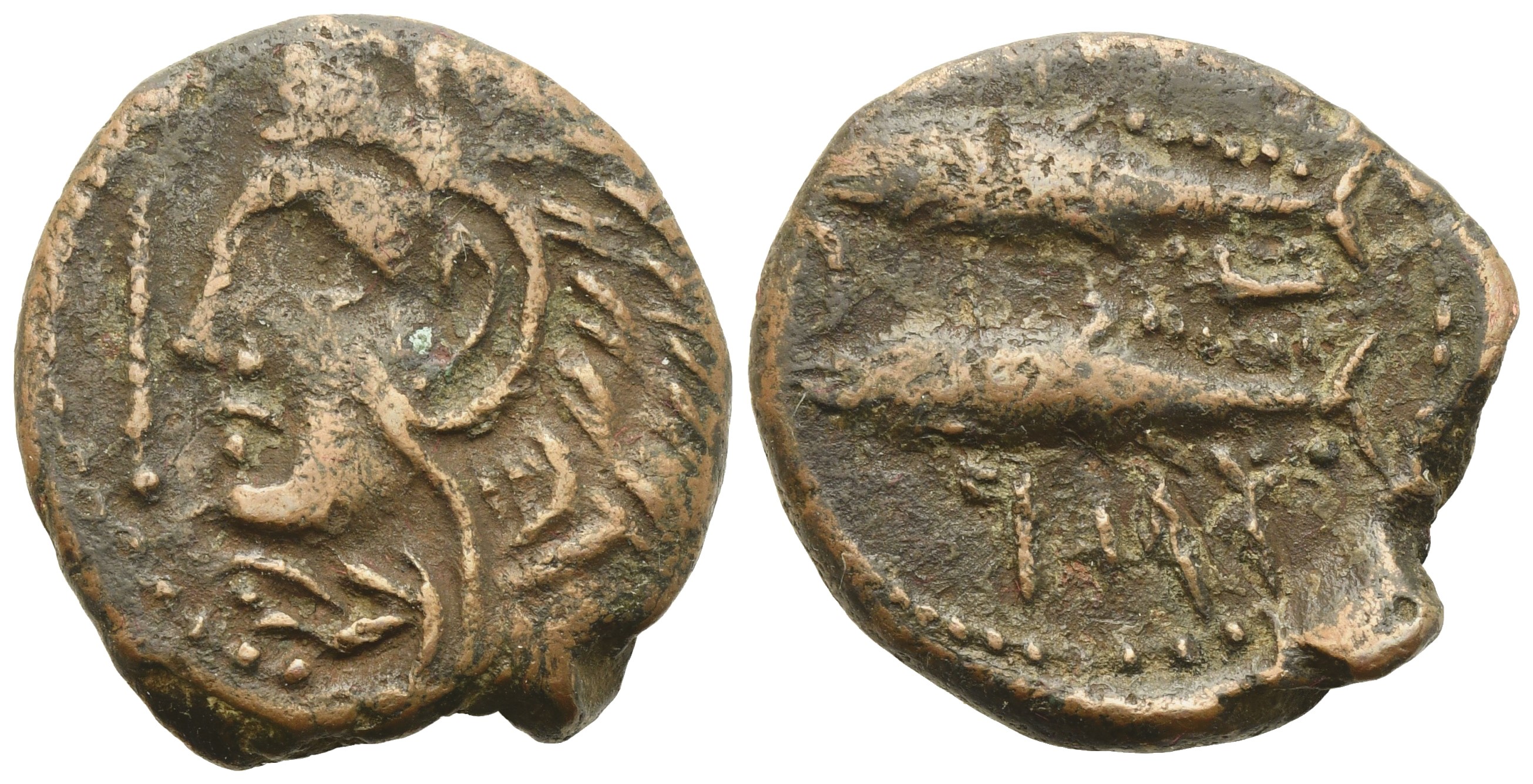 Head of Hercules left; before, club; Rv. Two tunnies left, Punic legend below. FAB 1347; ACIP 688. Light brown patina. Good fine.