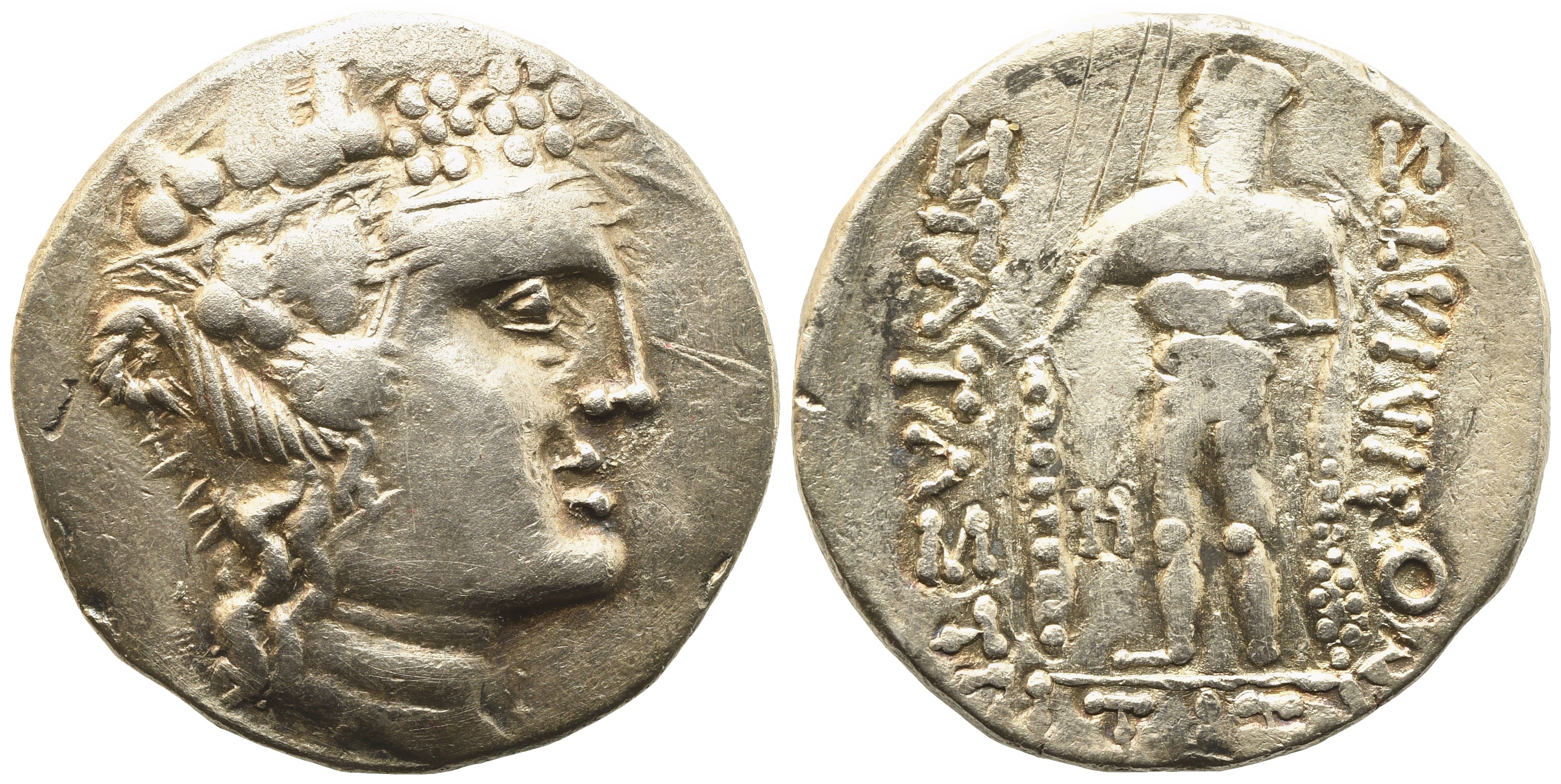 Imitating Thasos type. Head of Dionysus to right; Rv. Debased legend. Youthful Herakles, nude, standing facing, head left, holding club in right hand and lion skin in left; in field to left, N. Coll. Lanz 970 ff.; Göbl OTA class III-IV. Good very fine.