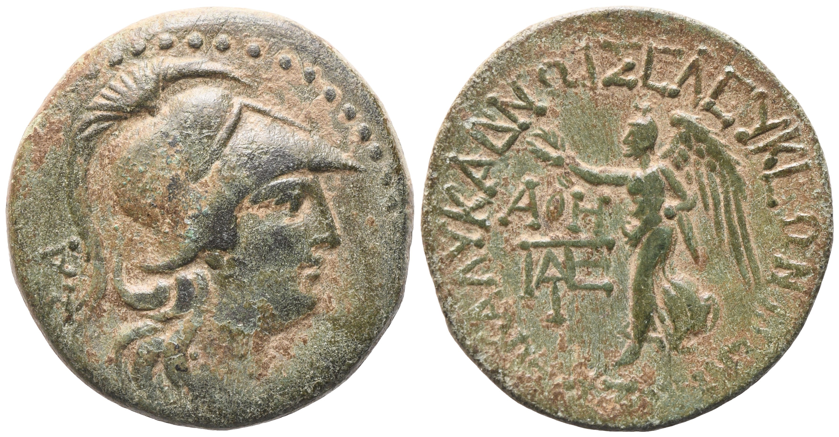ΣA Helmeted head of Athena r.; Rv. ΣΕΛΕΥΚΕΩΝ ΤΩΝ ΠΡΟΣ ΤΩΙ ΚΑΛΥΚΑΔΝΩΙ Nike advancing l. holding branch; AΘΗ over Monogram to left. SNG France 895-897. Green patina with red hues. Good very fine.