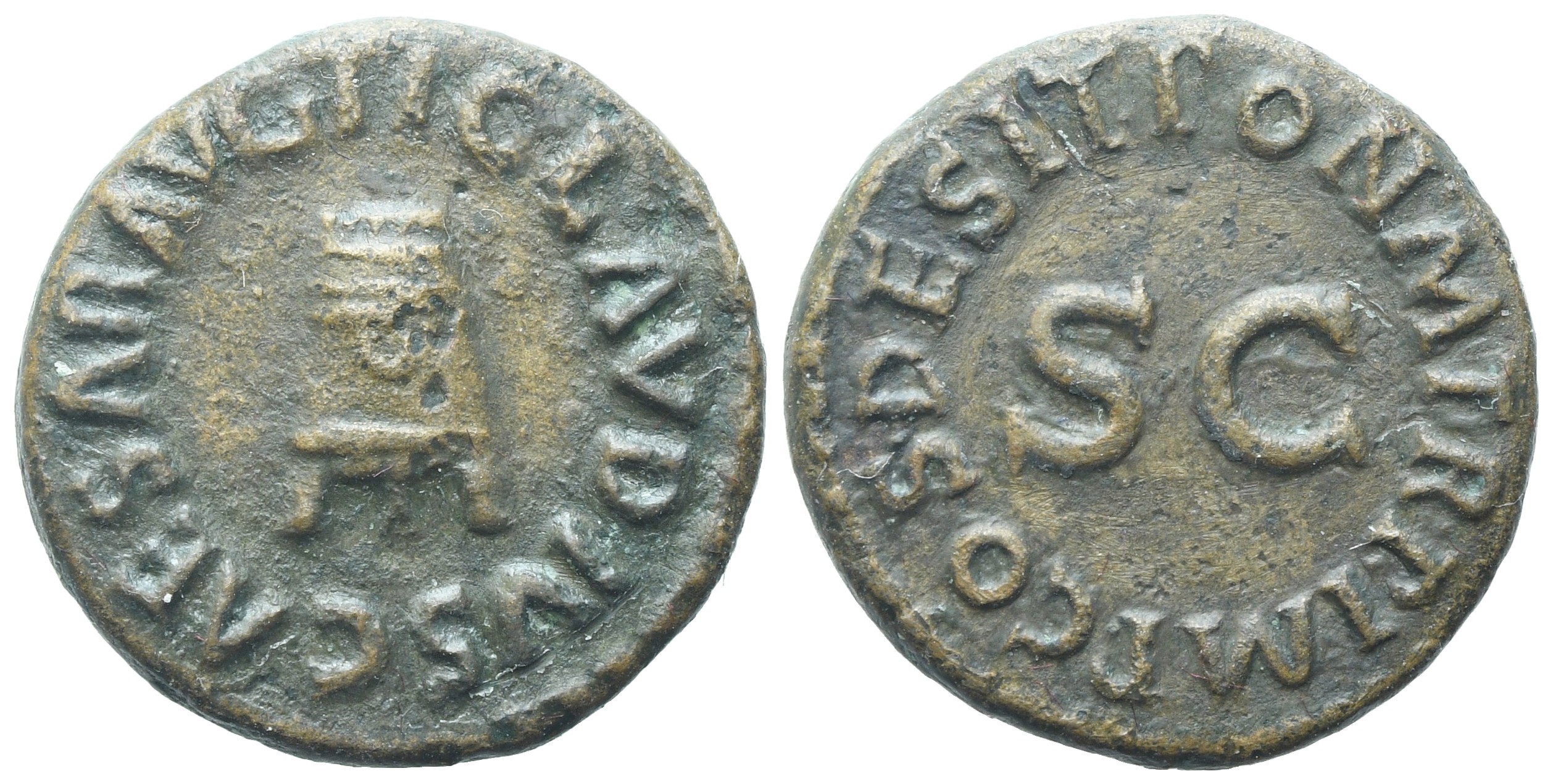 TI CLAVDIVS CAESAR AVG Three-legged modius; Rv. PON M TR P IMP COS DES IT around SC. RIC I, 84. Cohen I, 70. BMCRE 179. Brownish green patina. Good very fine.