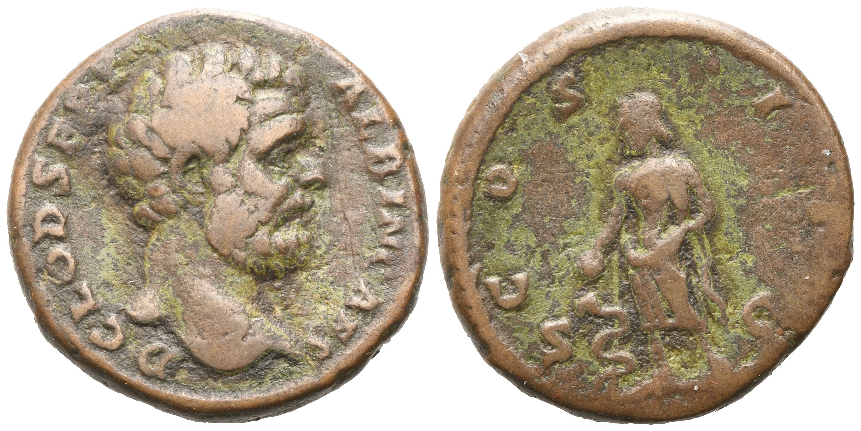 D CLOD SEPT ALBIN CAES Bare head to r.; Rv. COS II / S β C, Aesculapius standing facing, head to l., holding serpent-entwined staff. RIC 57b. Brown and green patina. VF