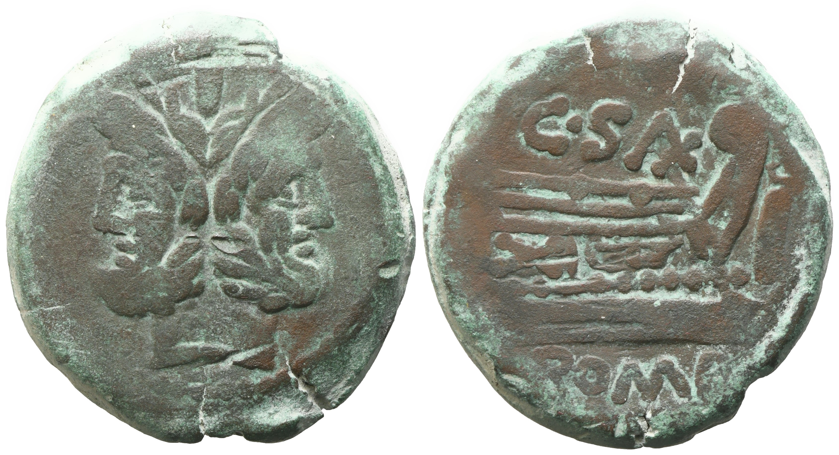 Mint: Rome. Laureate head of Janus; above,I (mark of value); Rv. Prow r.; above, C·SAX (AX ligate); before, mark of value. Below, ROMA. Crawford 173/1; Babelon (Clovia) 6; Sydenham 360; RBW 732. Dark and brown patina. Very fine.