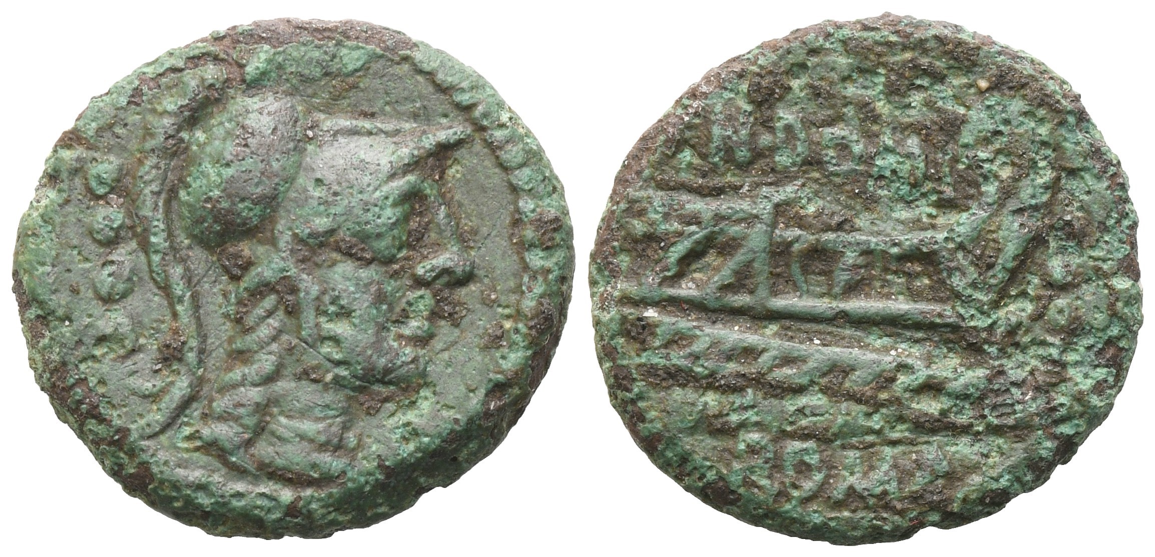 Helmeted head of Minerva r., four pellets above; Rv. Prow r., CN·DOMI above, four pellets before, ROMA below. Crawford 261/3. Sydenham 515a. Dark green patina. Rare. VF
