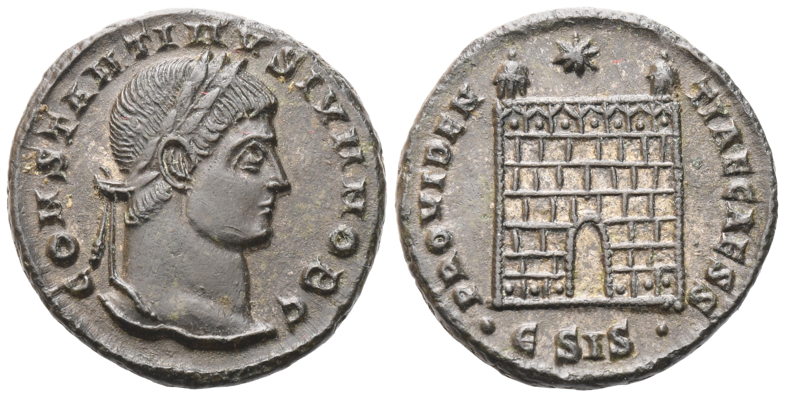 CONSTANTINVS IVN NOB C Laureate head r.; Rv. PROVIDENTIAE CAESS Campgate with two turrets, star above; in exergue, ·ЄSIS·. RIC 202. Good extremely fine.