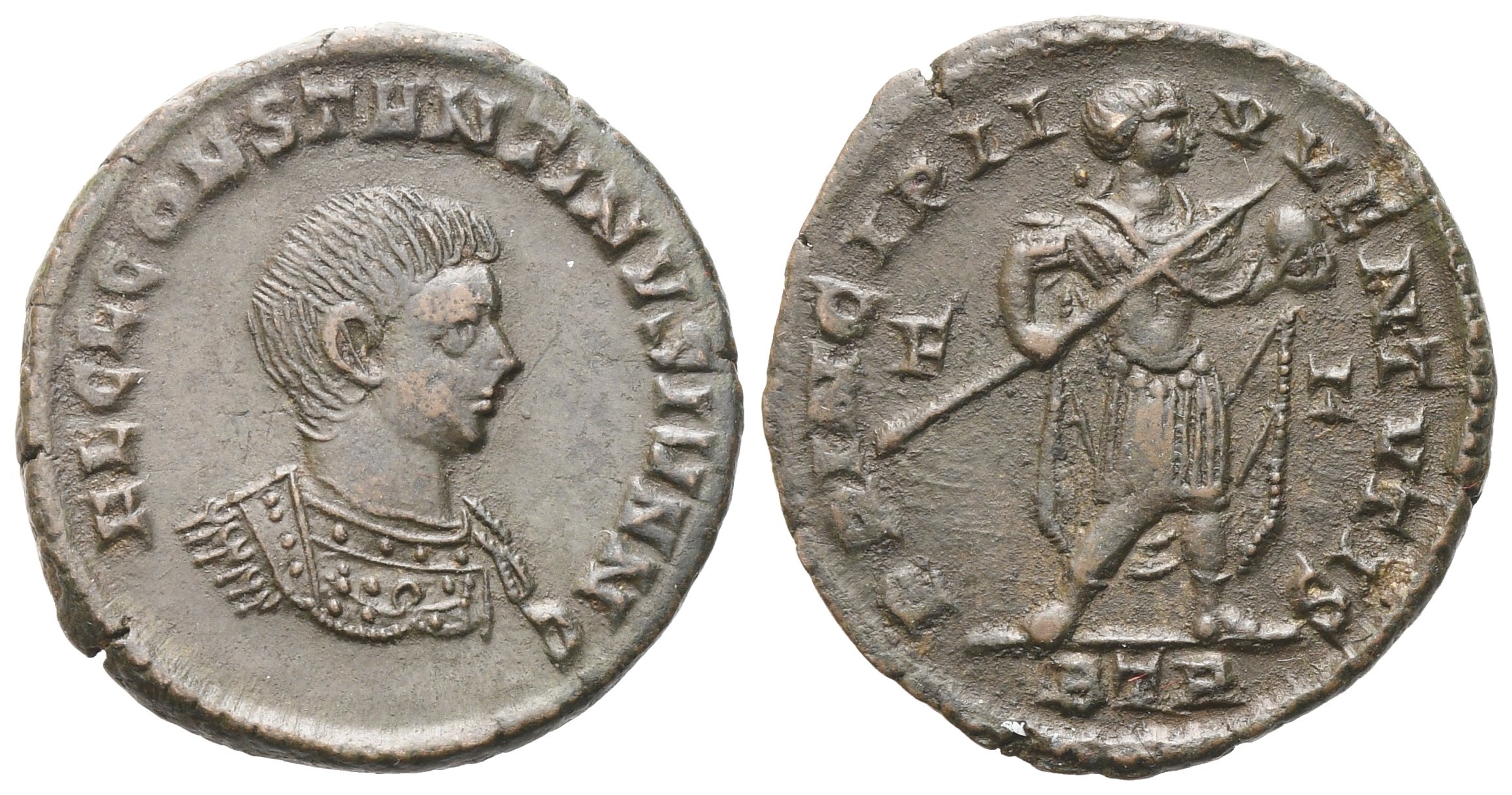 FL CL CONSTANTINVS IVN N C Bare-headed and cuirassed bust to r.; Rv. PRINCIPI IVVENTVTIS, Prince standing to r., holding transverse spear and globe; F β T across fields, BTR in exergue. RIC VII 174. About extremely fine.
