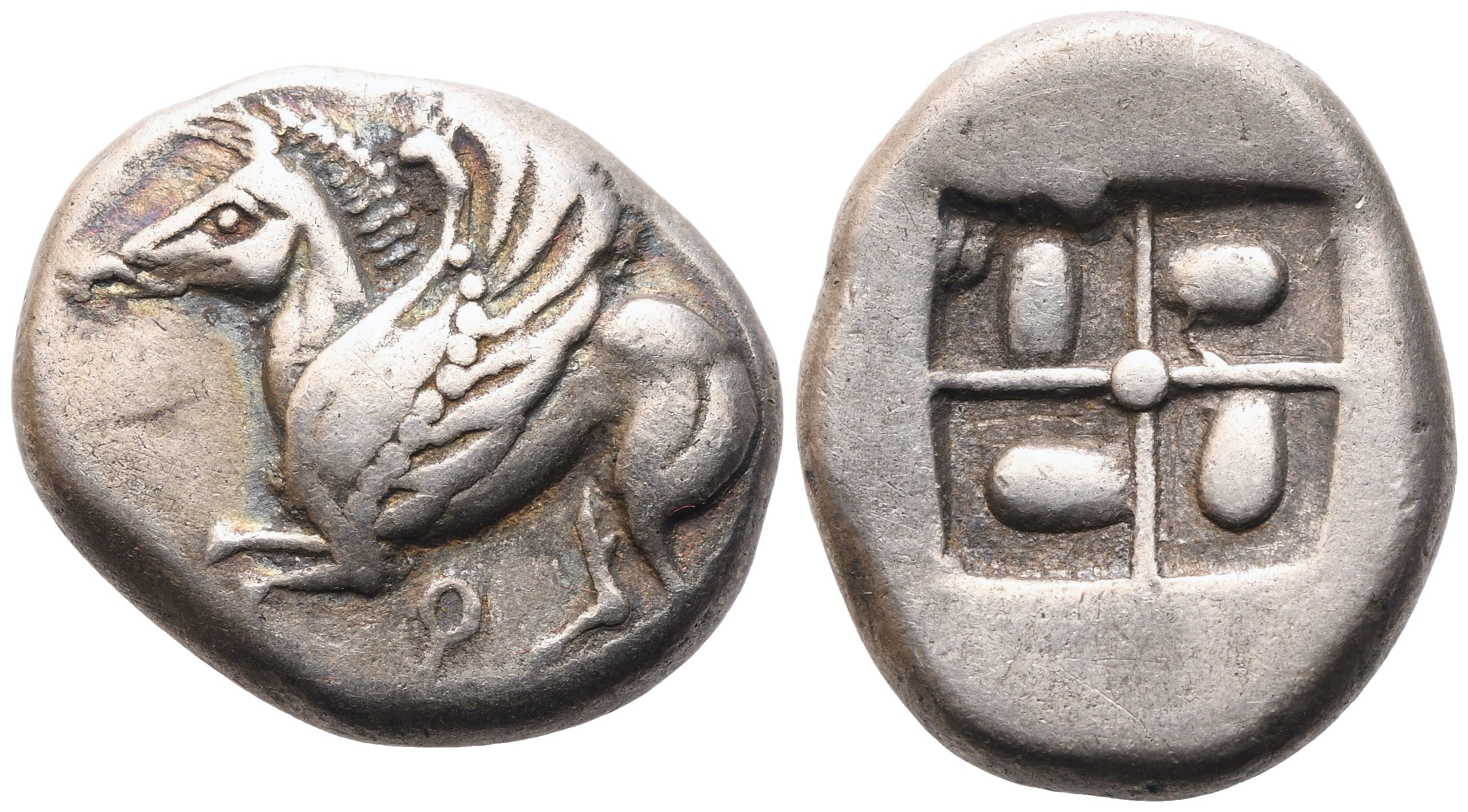 Pegasos flying left; Q below; Rv. Quadripartite incuse square with swastika pattern. Ravel 26; BCD Corinth 3; Pegasi 14. Almost gVF.